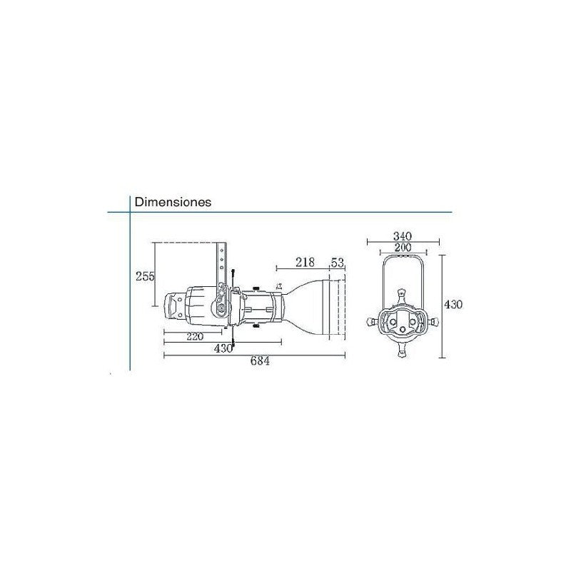 Halogen cutout with fixed 10º optics , 4 blades and filter holder included. Power supply 230–240 V, 50/60 Hz ; consumption 575/750 W depending on the lamp. HPL lamp 575/750 W (not included), G9.5 , 3200 K . Optics: aluminium reflector + 10º lens. Die-cast aluminium body. Dimensions 684 × 430 × 340 mm ; weight 6.2 kg . CE/RoHS certification . Use: theatre, auditoriums, stages.
