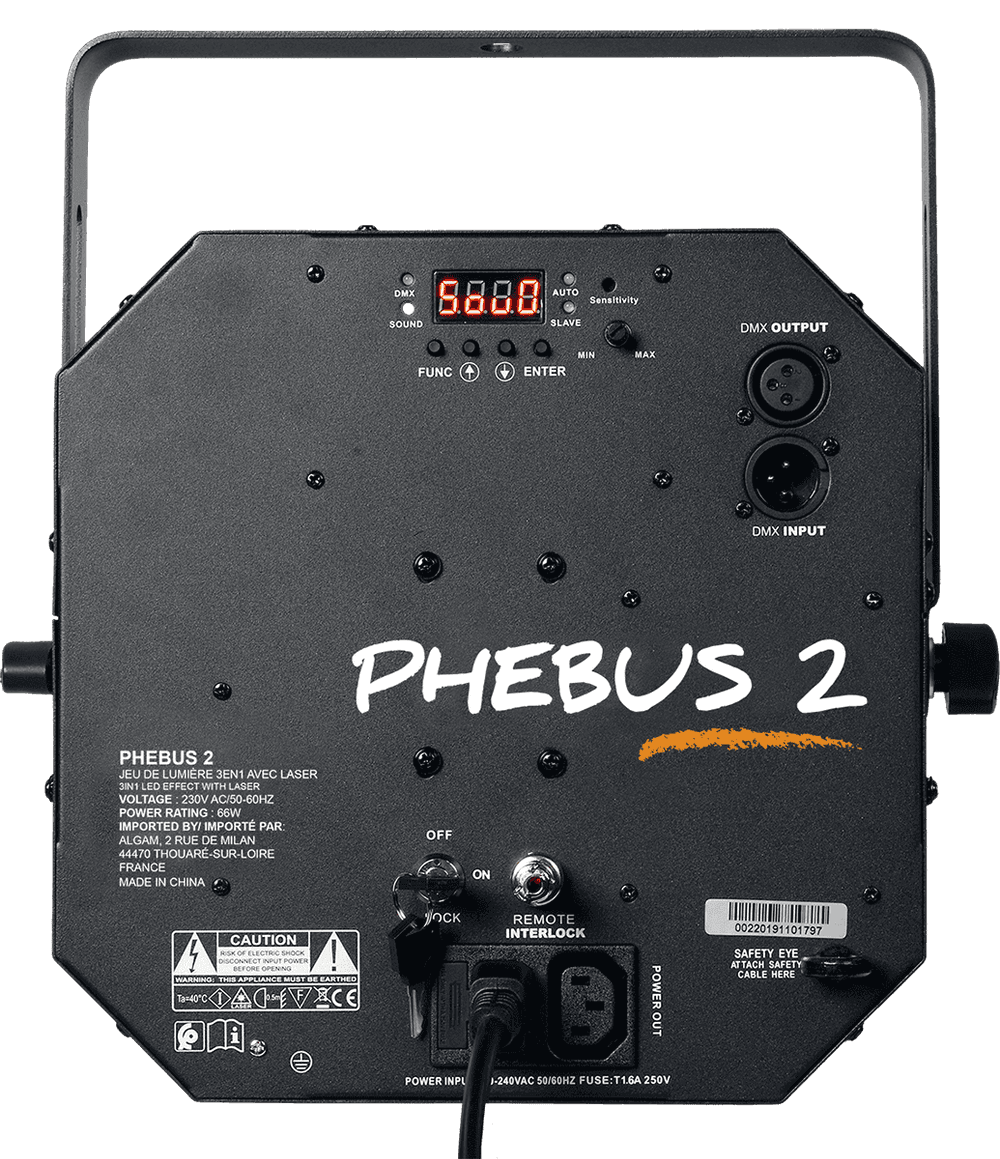 Derby, Strobe, Laser In this version 2, the 8 LEDs that provide the strobe effect become 4-in-1, capable of generating both white and color. The Phebus2 is a machine that can create a dance floor atmosphere for hours. Its numerous internal programs guarantee a wide variety of rotating effects in different modes. Whether it's the integration of the DMX protocol, the presence of an internal microphone for music recognition, or its robust construction, the Phebus2 will be as comfortable in a private setting as in a professional one.