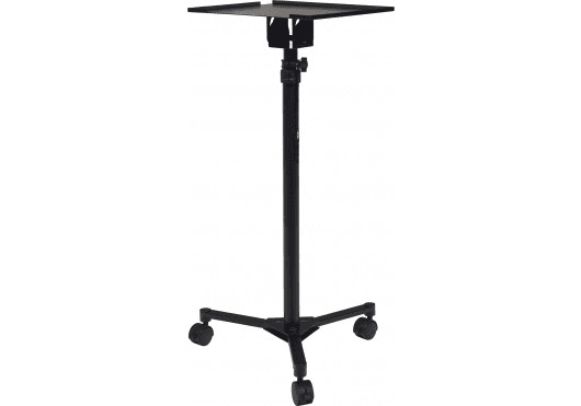 Mobile steel stand, 390x290 mm rotating and tilting shelf, height 880–1430 mm with locking every 100 mm, 3 wheels (1 with brake), arm with safety pin.