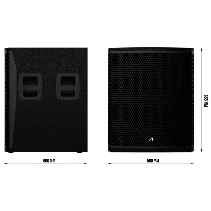 Active subwoofer 18″ ( 4″ voice coil); 1800 W RMS / 3600 W peak ; 35–150 Hz ; 97 dB (1 W/1 m); SPL 142 dB peak (≈131 dB continuous); DSP with low-pass filter , 6-band EQ and CAN BUS/RS485 network ; 1× Mic/Line XLR/Jack input , 1× XLR output ; pole mount ; multi-layer laminated wood enclosure ; AC 220–240 V, 50 Hz ; dimensions 560 × 600 × 655 mm ; weight 40 kg .