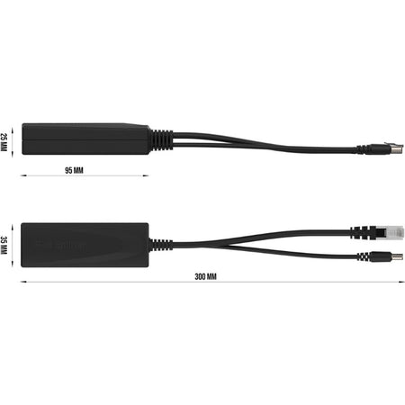 PoE splitter for non-PoE devices; RJ45 input (PoE/PoE+) ; outputs: RJ45 (data) + DC 12 V jack ; maximum power 25 W ; IEEE 802.3af / 802.3at compatibility; recommended use: IP cameras and 12 V equipment in professional installations.