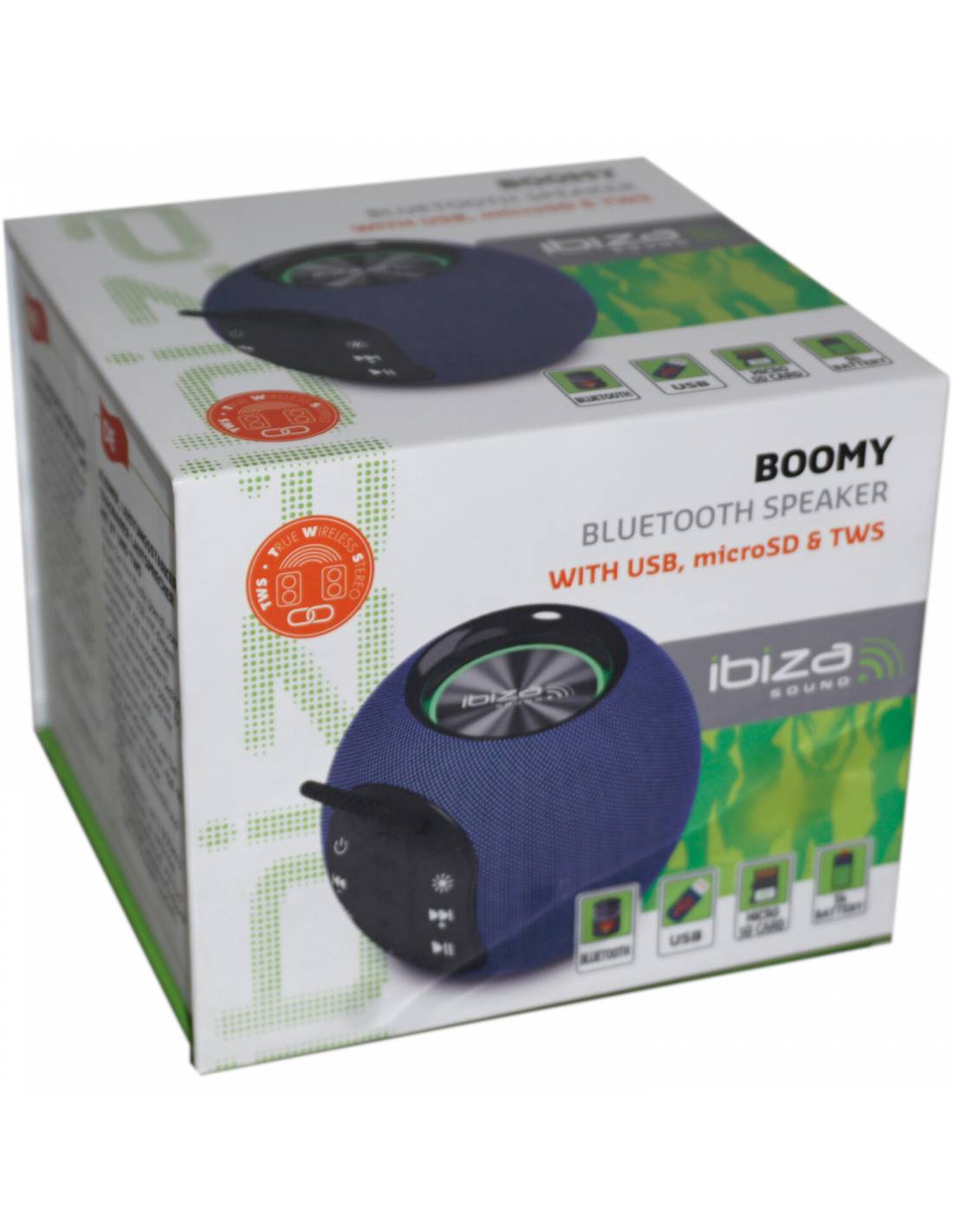 BOOMY mini speaker: 2.5″ driver, Bluetooth 4.2, USB, microSD, AUX, TWS, 3.7 V/1,500 mAh battery (5 h), RGB LED ring auto/sound modes, 5 V/1 A USB charging, 110×110×90 mm, 0.37 kg.