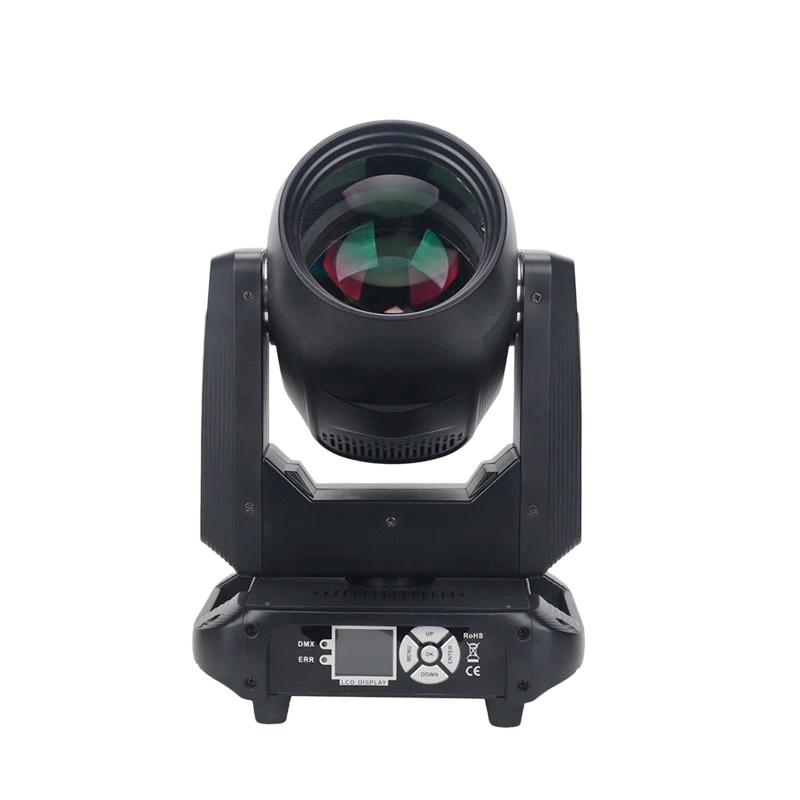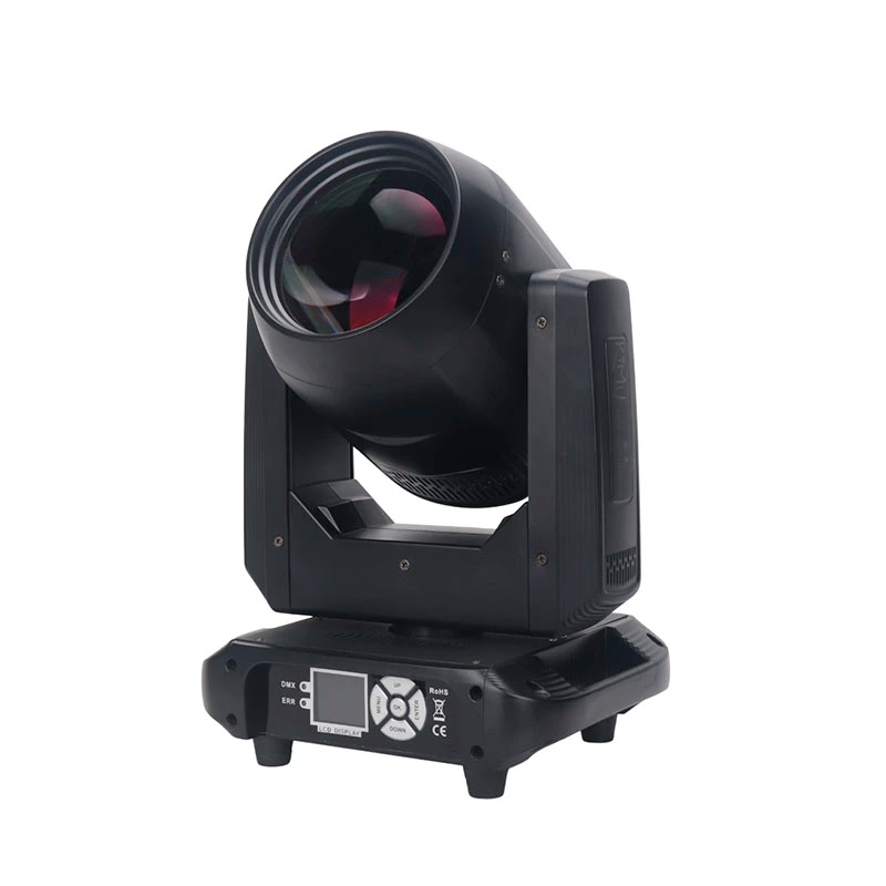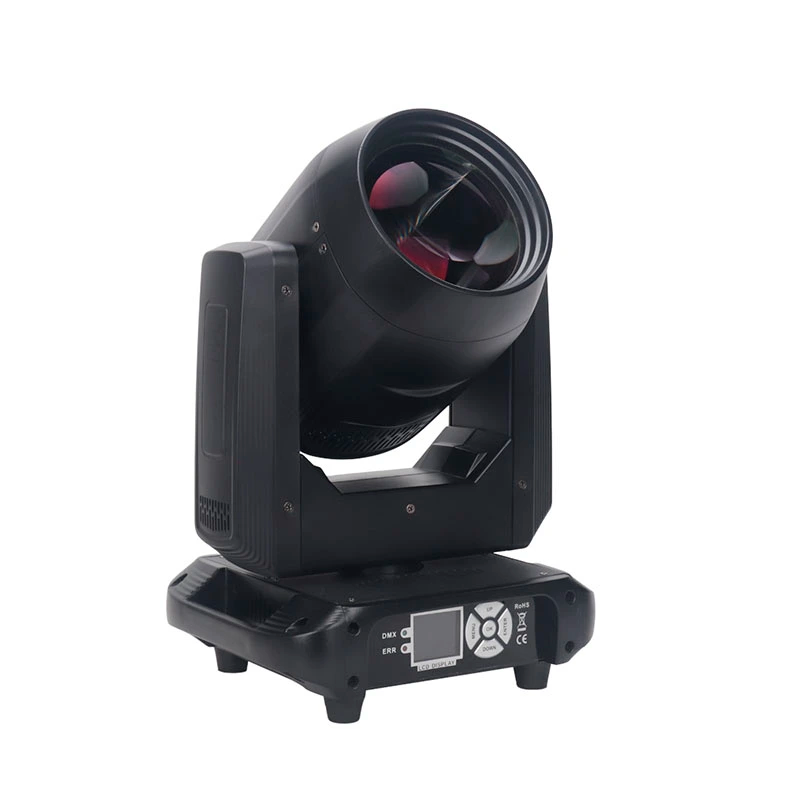 200W LED beam moving head, 2° beam, 12 gobos, 8 colours + rainbow, 6/12-facet double prism, DMX512 (11/13 CH), pan 540°, tilt 180°, 12,630 lm, 250W, 35×26×29 cm, 3.5 kg.