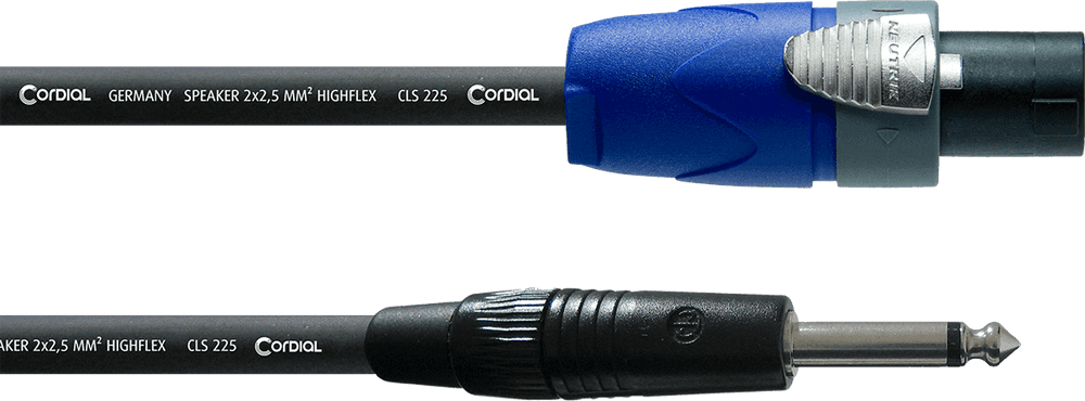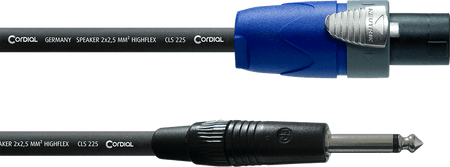 Cable de altavoz profesional de 10 metros de longitud, compuesto por cable Cordial CLS 225 con una sección de conductor de 2 x 2.5 mm² fabricado en cobre libre de oxígeno (OFC). Incorpora conectores Neutrik; en un extremo un conector Speakon de 2 polos y en el otro un conector jack mono de 6.35 mm (TS). El diámetro exterior del cable es de 7.8 mm y posee una cubierta de PVC de alta flexibilidad y resistencia. La resistencia del conductor es de aproximadamente 8 Ohm/km.
