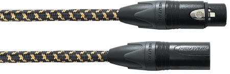 Cable de micrófono profesional balanceado de 5 metros de longitud, perteneciente a la serie conmemorativa del 25 aniversario. Incorpora un conector XLR macho de 3 pines y un conector XLR hembra de 3 pines, ambos fabricados por Neutrik con contactos bañados en oro. El cable utilizado es un Cordial CMK 234 con una sección de conductor de 2x 0.34 mm² (AWG 22), compuesto por 26 hilos de cobre de 0.127 mm. Presenta un apantallamiento en espiral de cobre y una baja capacitancia de 60 pF/m. El revestimiento exterior es de tejido tweed sobre una cubierta de PVC, con un diámetro total de 6.2 mm.