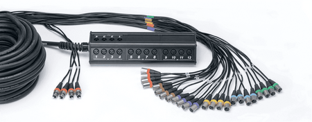 Sistema de audio multicore analógico compuesto por una caja de escenario de sobremesa con chasis metálico y una manguera de cable de 30 metros. La configuración de canales es de 24 entradas y 4 salidas. Todos los conectores son de tipo XLR de 3 pines, fabricados por REAN. El sistema incluye protección contra tirones y torceduras tanto en la caja como en el spliter del cable. El spliter cuenta con tubos termorretráctiles marcados para la identificación de canales.