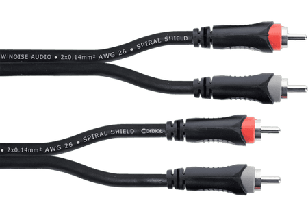 Cable de audio estéreo no balanceado de 6 metros de longitud. Configuración de doble cable con conectores 2 x RCA macho a 2 x RCA macho marca REAN by Neutrik con contactos niquelados. El área del conductor es de 2 x 0.14 mm², compuesto por 18 hilos de cobre libre de oxígeno (OFC) de 0.10 mm. Dispone de un apantallamiento en espiral de cobre con una cobertura del 90%. La cubierta exterior es de PVC de color negro, con un diámetro de cable combinado de 4 x 8 mm. Incluye marcación de canal por color.