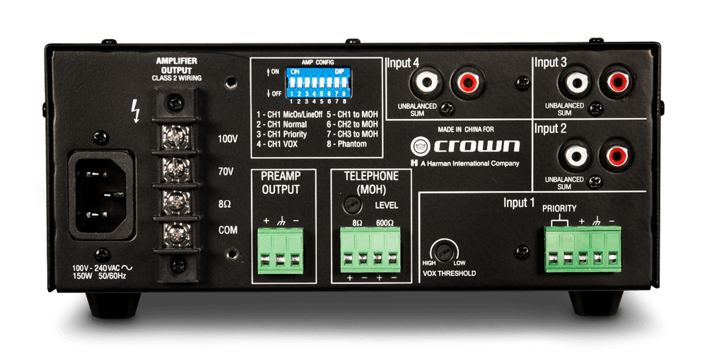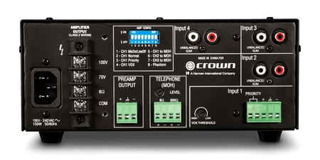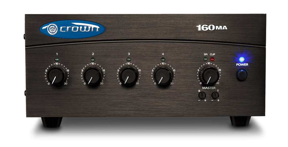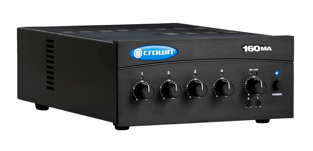 The CROWN 160MA is a high-value commercial audio mixer-amplifier that combines four independent inputs with a 60W amplifier in a 1U chassis. It facilitates the sound reinforcement of paging , background music and music on hold environments, offering low impedance (8 Ω) and constant voltage (70 V / 100 V) outputs without additional transformers. It also integrates priority muting functions by VOX or switch, phantom power for microphones, and bass and treble controls on the master output.