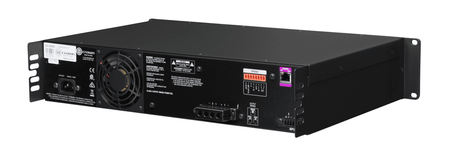 600W @4 Ω dual-channel 2U rack amplifier (compatible with 2/4/8/16 Ω and 70/100 V), DSP with parametric EQ, LevelMAX™ crossover, delays and limiters, input router, HiQnet™ TCP/IP, front LCD, variable cooling, active PFC; 483 × 89 × 356 mm; 8.2 kg.