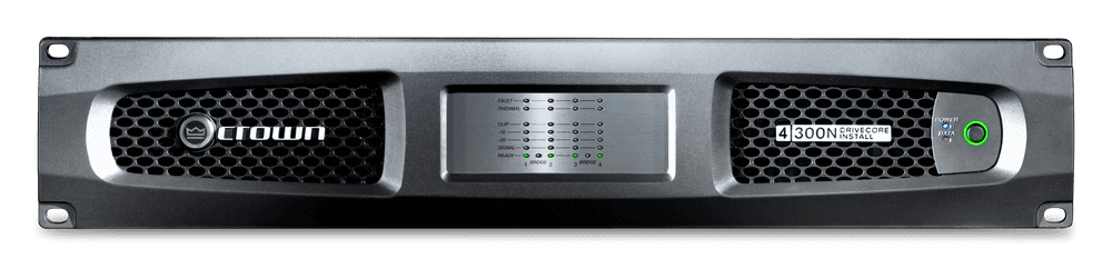 The CROWN DCi 4|300N integrates DriveCore™ technology into a high-performance installation amplifier with four independent 300W channels at 4 Ω and constant voltage outputs of 300W at 70 Vrms and 100 Vrms without the need for external transformers. Its BLU-Link™ digital audio engine carries up to 256 channels with low latency and, together with balanced analog inputs and a priority router, ensures signal continuity. The HiQnet™ over TCP/IP protocol enables remote network monitoring and control, while programmable GPIO ports and onboard DSP (LevelMAX™ limiters, input/output EQ, crossover, delay, matrix and line monitoring) provide maximum flexibility. It complies with the EN 54-16 standard for voice alarm systems and features front-to-back forced cooling and a universal power supply with active PFC for efficient and reliable operation.