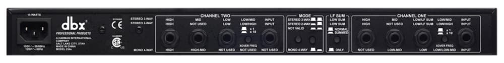 dbx 234s active crossover ; 2/3-way stereo or 4-way mono modes; 24 dB/oct Linkwitz-Riley filters; crossover ranges: 45–960 Hz (Low) and 450 Hz–9.6 kHz (with x10 ); Low Cut 40 Hz (Butterworth 12 dB/oct) per channel; switchable LF Sum (sub mono); Balanced 1/4” TRS inputs/outputs (electronically balanced inputs; impedance-balanced outputs); ±12 dB input gain ; independent level and phase reverse on each output; performance: BW 20 Hz–20 kHz +0/−0.5 dB , FR <3 Hz–>90 kHz +0/−3 dB , DR >106 dB , THD+N <0.004% (@ +4 dBu, 1 kHz), crosstalk < −80 dB; levels: max. input > +22 dBu, max. output > +21 dBu (≥ 2 kΩ); power supply 100/120/230 V~ , 15 W ; dimensions 44.5 × 482.6 × 175 mm (H × W × D); weight 1.8 kg (shipping 2.6 kg ).