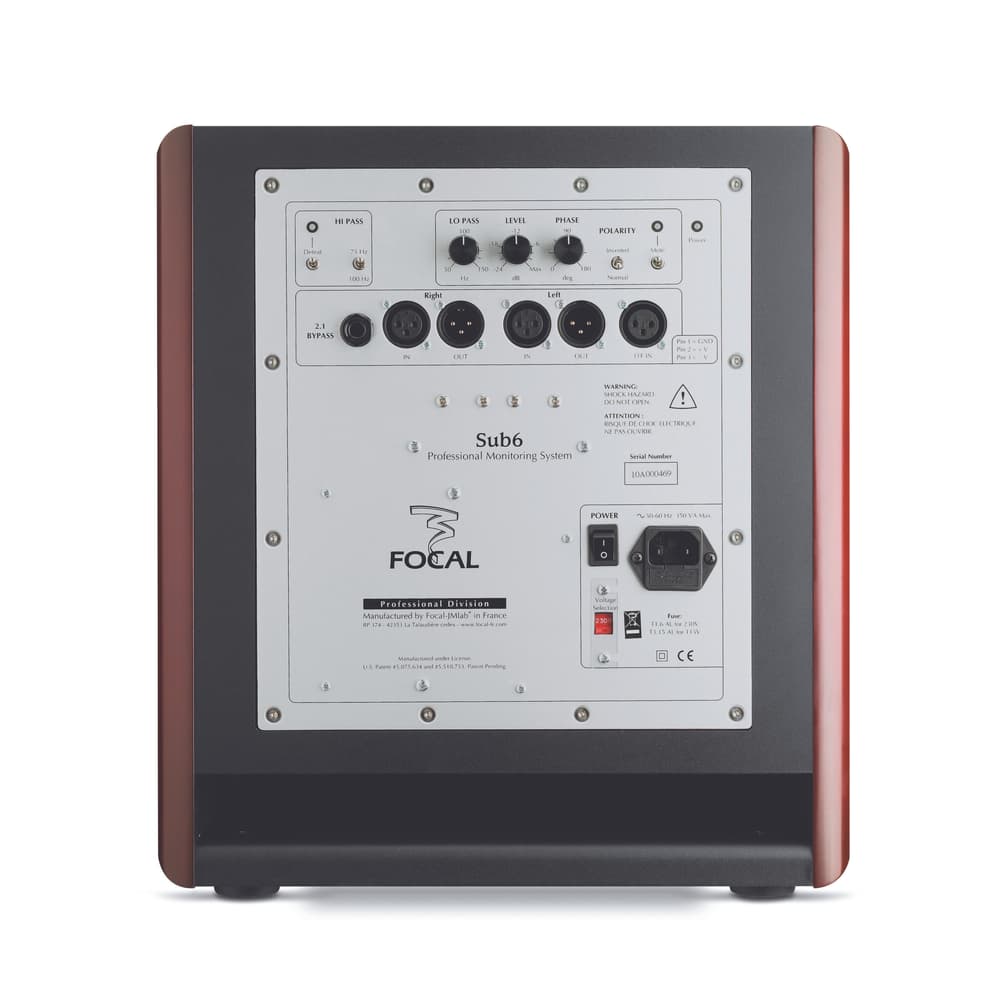 The FOCAL SUB 6 is a professional reference active subwoofer, designed to integrate perfectly with Focal monitors in 2.1, 2.2 and multi-channel configurations. It is equipped with a powerful 350 W RMS BASH® amplifier that combines Class AB sound quality with Class D efficiency and an 11″ (27 cm) composite sandwich “W” cone housed in a large-volume bass-reflex enclosure, guaranteeing bass linearity at any sound pressure level. It features extensive adjustment possibilities: stereo high-pass crossover (75 Hz–100 Hz), mono low-pass, phase inversion and adjustment, polarity switch, level control, mute and bypass via footswitch, as well as Left/Right/LFE inputs and Left/Right outputs, all in a Red Burr Ash “Made in France” finish.