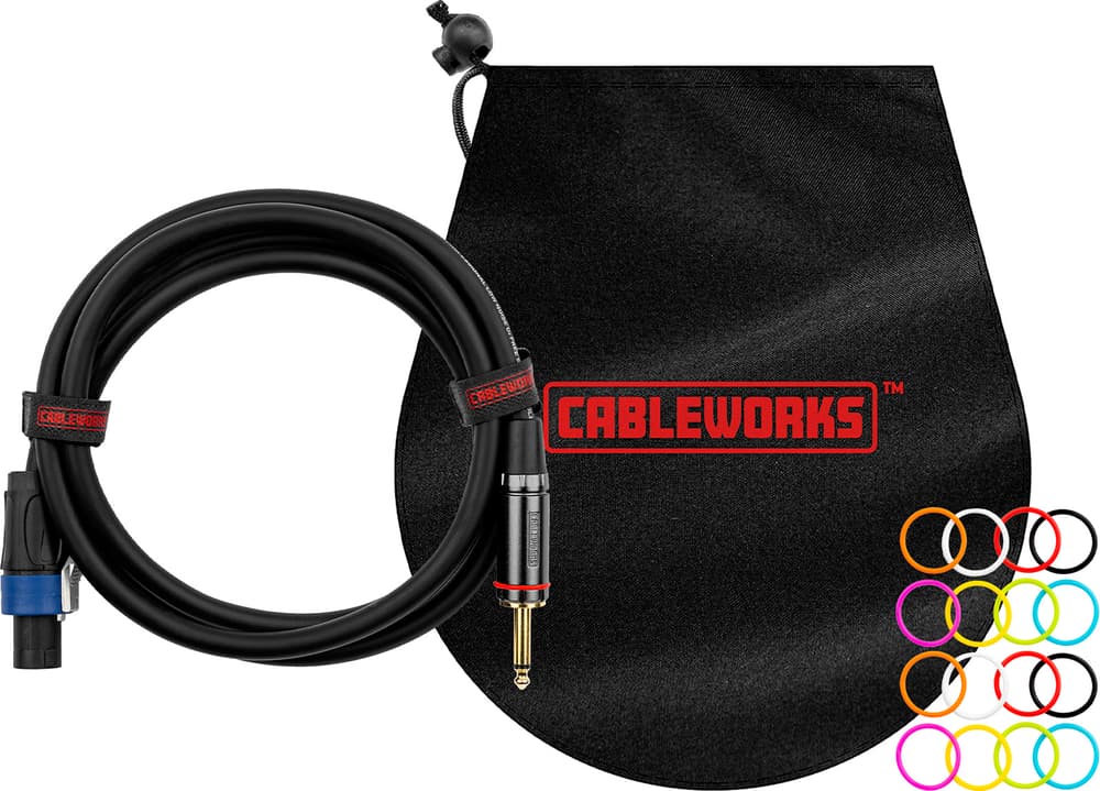 Cable de altavoz profesional, 1,8 m, jack TS 1/4" recto a speakON (Twist-Lock), conductor OFC 99,99 % estañado, 2 x 12 AWG (≈3,31 mm²), aislamiento de baja capacitancia, conectores propietarios Cableworks con plug de latón dorado en el extremo jack, alivio de tensión tipo “chuck”, anillos identificativos TORIColor, vaina exterior flexible.