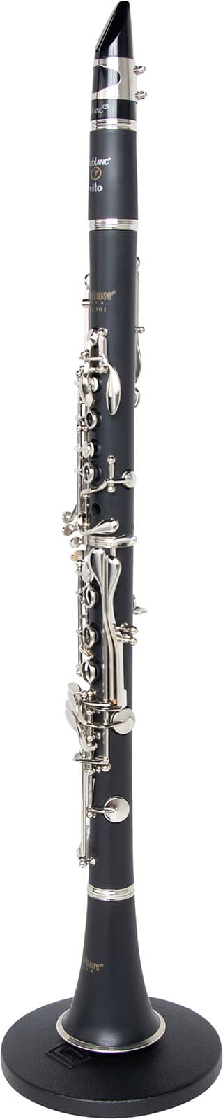 Soporte vertical para clarinete/flauta con base redonda lastrada (Ø 165 mm) y pies antideslizantes. Clavija suave y desenroscable. Construcción en acero con acabado negro. Compatibilidad: flauta estándar y clarinetes Bb/A/Eb. Dimensiones del producto: 132 × 132 × 191 mm. Peso neto: 1,2 kg.
