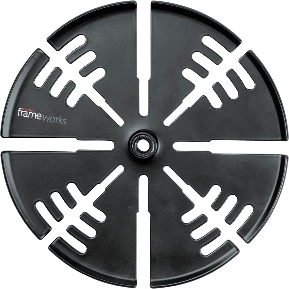 Organizador de cables para pie de micrófono, modelo GFW-CABLEHNGRTRAY. Rosca de montaje: 5/8"-27 (hembra). Material: acero con pintura en polvo, color negro. Ranuras: 32, espacios alternos 5–9 mm. Dimensiones: 197 × 197 × 6 mm. Peso neto: 0,36 kg. Capacidad de carga aprox.: 4,5 kg. Orificios de montaje: opciones de distancia corta y amplia.