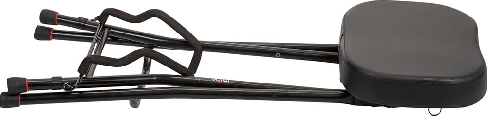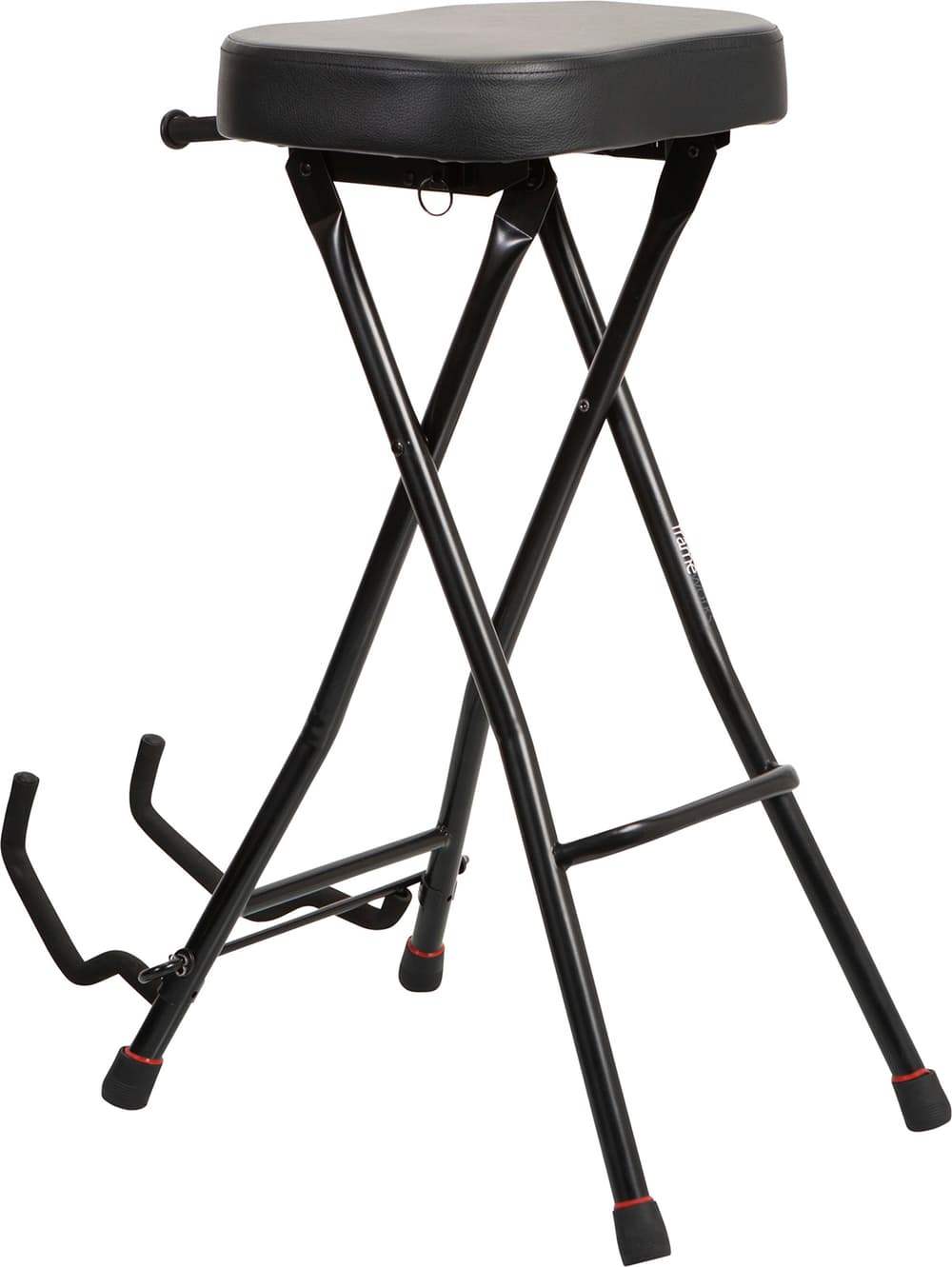 Taburete para guitarrista con soporte integrado Gator Frameworks GFW-GTRSTOOL; altura de asiento 71,1 cm; cojín acolchado 6,4 cm; reposapiés integrado; plegable; compatible con guitarras acústicas, eléctricas y bajos; conteras de goma con aro rojo; carga máxima 113,4 kg; dimensiones exteriores plegado aprox. 91,4 x 35,6 x 14,0 cm; color negro; peso neto aprox. 4,1 kg.