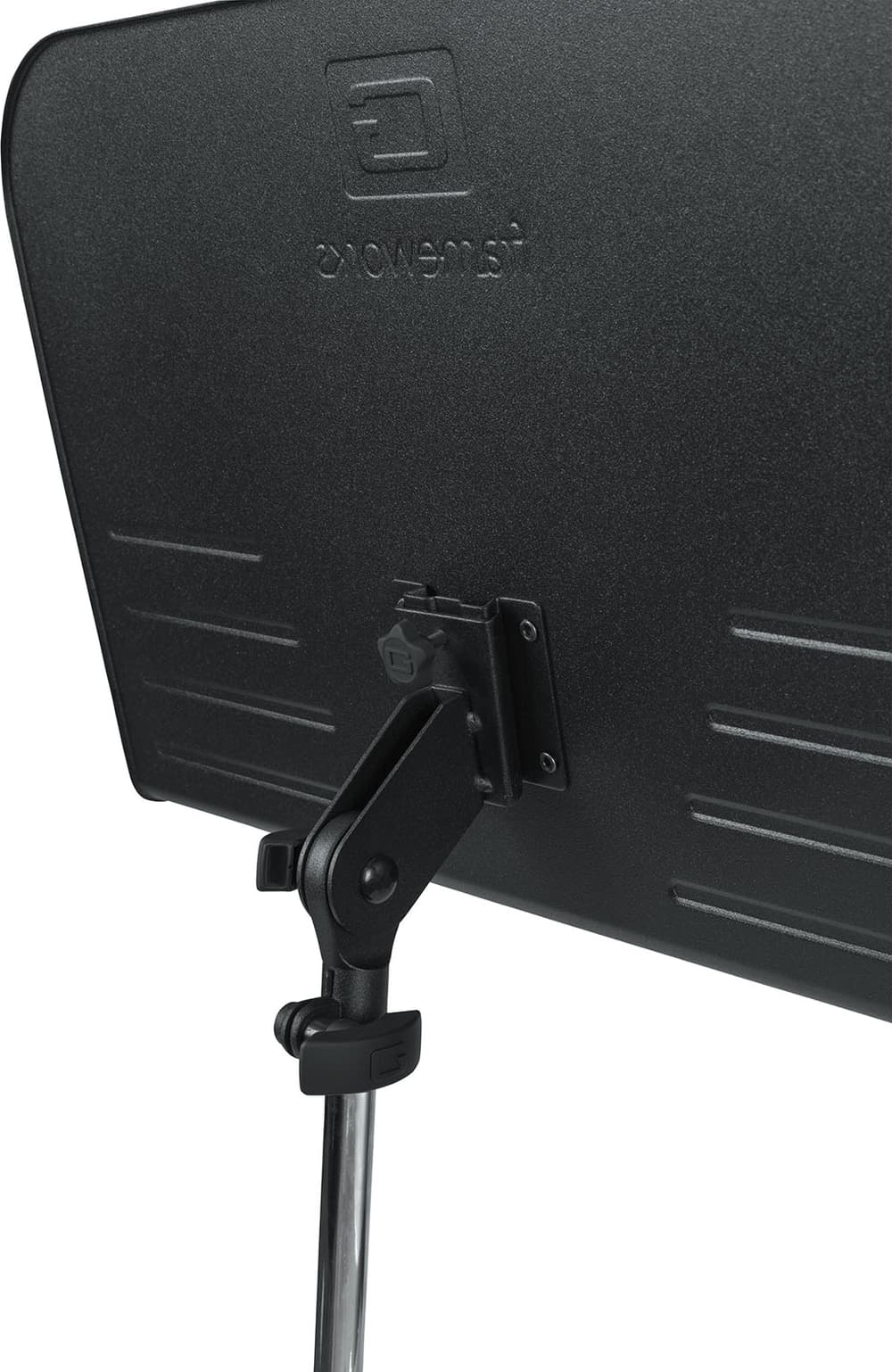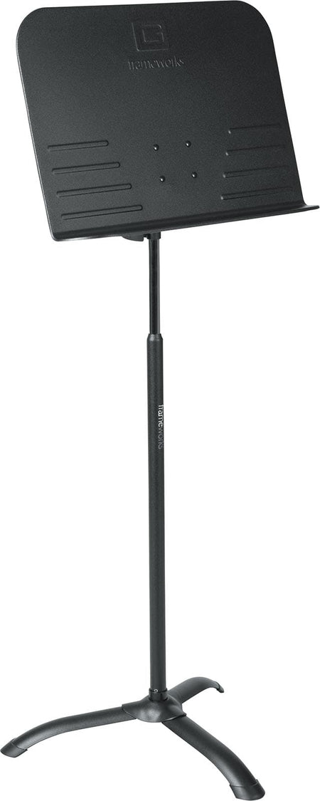 Atril de partituras tipo estándar con embrague de fricción accionable con una mano; bandeja de 19" (482 mm); altura regulable 660–1219 mm; base de trípode con pies de goma antideslizantes extraíbles; inclinación de bandeja ajustable. Modelo: GFW-MUS-1000.