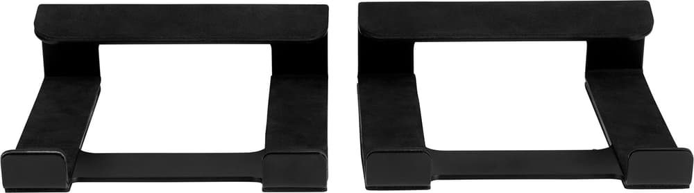 Pareja de soportes de sobremesa en cuña para monitores/altavoces; superficie con espuma EVA; base antideslizante y labio frontal de retención; dimensiones aprox. (huella) 18,4 × 15,0 × 5,1 cm; plataforma útil aprox. 17,8 × 15,2 cm; construcción robusta con acabado negro; uso recomendado para monitores de tamaño pequeño a mediano.