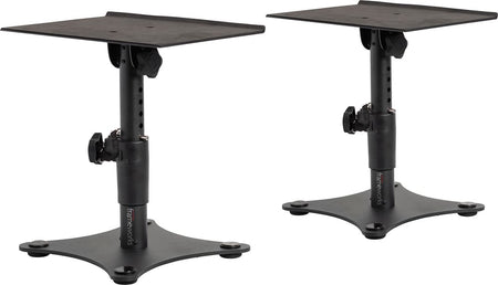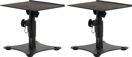 Par de soportes de sobremesa con base plana para monitores de estudio. Altura regulable 26,7–35,6 cm; inclinación 0–15°; plataforma 30,5 × 22,9 cm con superficie EVA; base 25,4 × 25,4 cm con cuatro pies de goma; construcción en acero con recubrimiento negro; orientación vertical u horizontal; capacidad de carga 27,2 kg por soporte; dimensiones por soporte 35,6 × 30,5 × 25,4 cm; peso del conjunto aprox. 3,9 kg.
