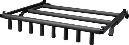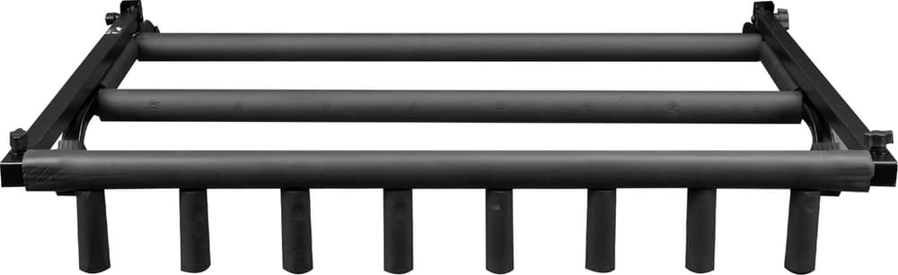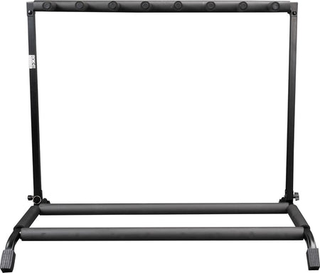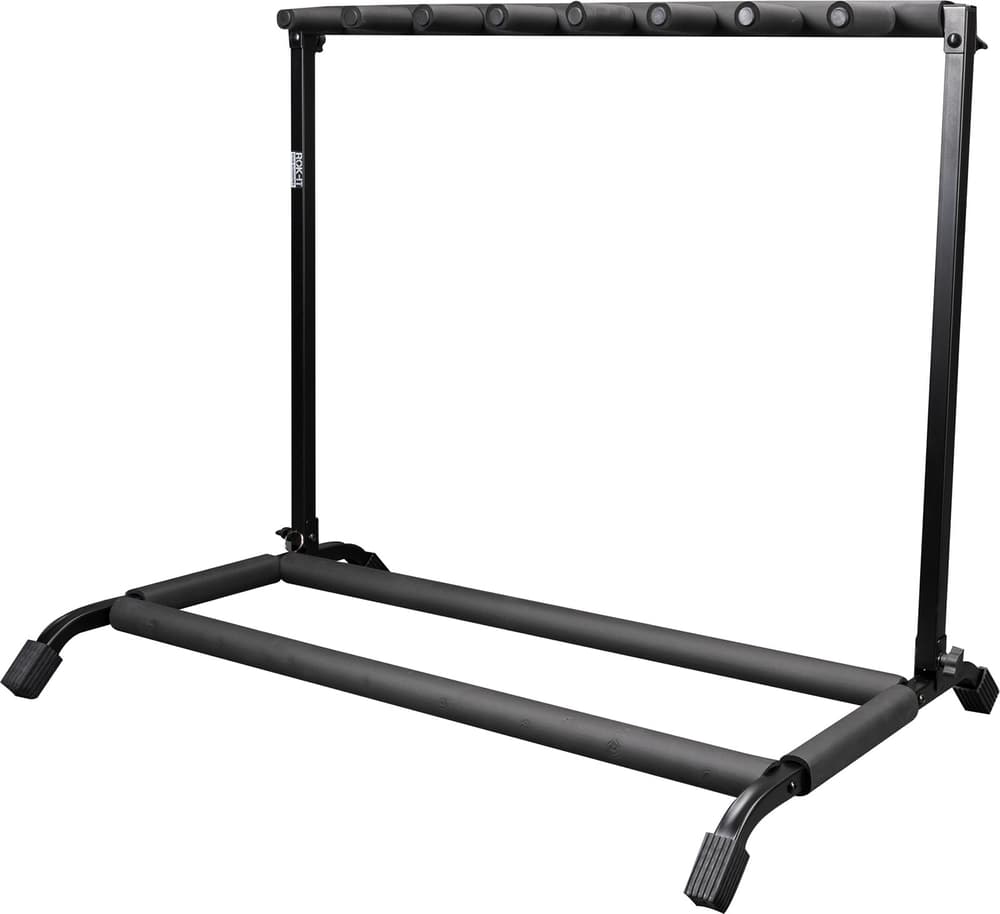 Rack múltiple plegable para 7 instrumentos (guitarras/bajos eléctricos o acústicos), estructura de acero con recubrimiento en polvo, acabado negro, superficies de apoyo con espuma acolchada, pies de goma antideslizantes, seguro para acabados de poliuretano estándar (no testado para lacas vintage/nitrocelulosa), dimensiones montado 806 × 533 × 673 mm (L × An × Al), peso neto 3,3 kg, diseño colapsable.