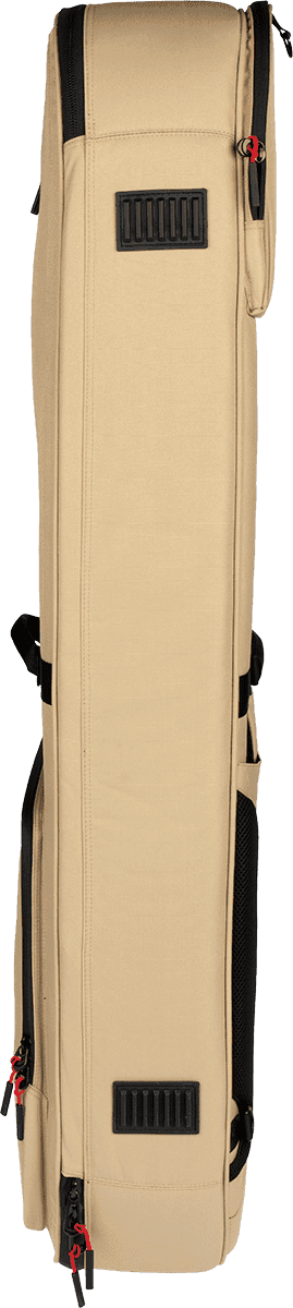 Pensada para el músico en movimiento, esta softcase incorpora correas de mochila ocultables con pequeño abrebotellas integrado, asas acolchadas reforzadas en frontal, trasera y lateral para distintos modos de transporte, y anillas en D (D-rings) escamoteables en la base para mantener una estética limpia cuando no se usan. Varias zonas de goma antideslizante y los parachoques ayudan a que la funda apoye sólida y segura tanto en vertical como en horizontal.