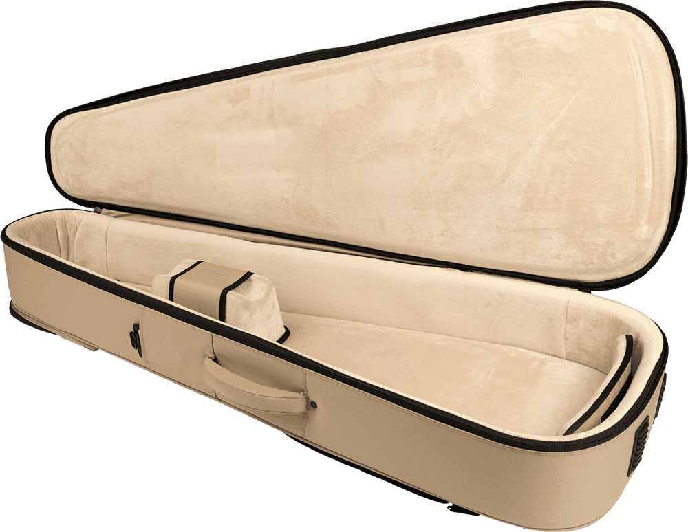 No es un estuche de madera o plástico rígido, sino una softcase semirrígida multicapa: ofrece más protección que una funda blanda convencional gracias a su chasis reforzado, pero conserva la ligereza y flexibilidad de una funda de concierto premium.
