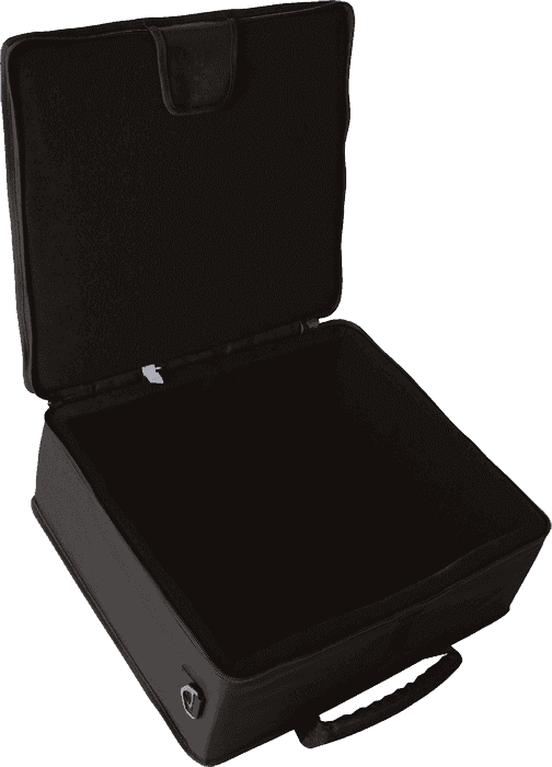 El interior está cuidadosamente forrado con un suave tejido de tricot para evitar arañazos y proteger los controles sensibles de su mezclador. Este forro interior también es compatible con separadores de velcro (no incluidos), permitiendo inmovilizar equipos de menor tamaño para un ajuste seguro. Para facilitar su transporte, el GMIX-L1622 incorpora dos asas de nailon reforzadas y una correa de hombro acolchada y desmontable, ofreciendo versatilidad para llevarlo cómodamente en cualquier situación. Además, cuenta con un práctico bolsillo exterior para guardar cables, fuentes de alimentación y otros accesorios esenciales, manteniéndolo todo organizado en un solo lugar.