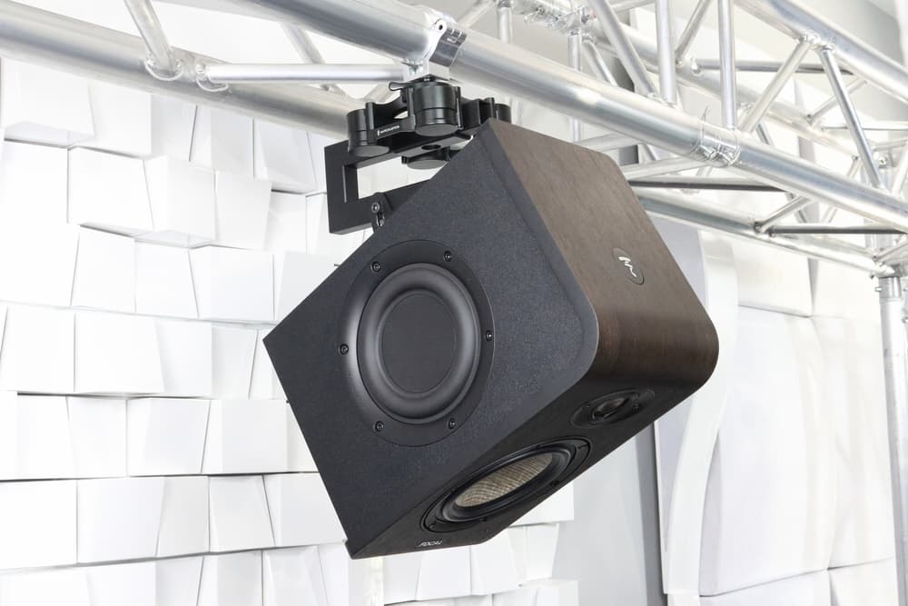 The IsoAcoustics C-Bracket mounts professional audio speakers to the V120 isolation ceiling and wall mount. It positions the speakers downward and can be tilted up to 45 degrees, making it easier to point the speakers at the listening position.