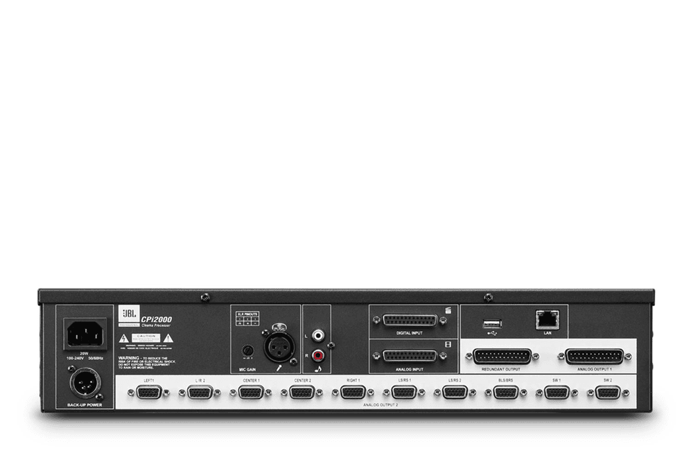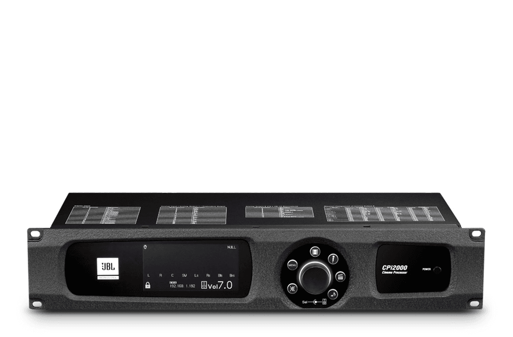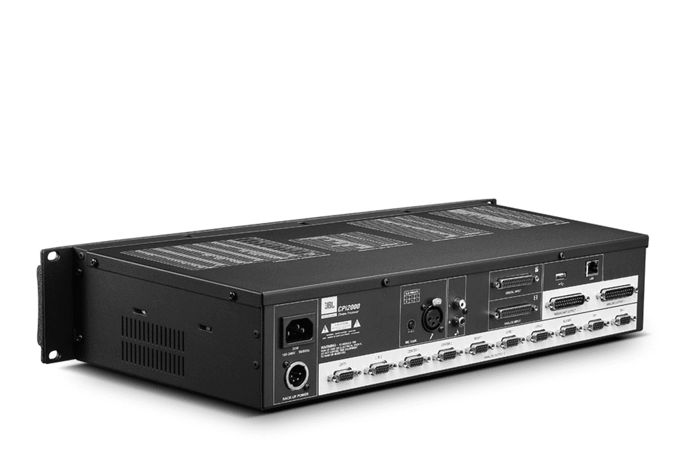 CPi2000 is a professional grade processor developed by JBL to provide audio enhancement and volume control for movie theaters. It features DSP processing, room EQ adjustment, volume control, and system fault detection and can be configured via a custom designed GUI software. CPi2000 offers four input options: Analog Input, Digital Input, No-Sync Input, and a mono Microphone Input. The Analog Input and Digital Input accept audio signals from any theater server. The No-Sync Input receives line-level stereo signals from a CD or DVD player for background music playback. The Microphone Input typically connects to an RTA microphone for room adjustment. CPi2000 installs ten (10) HD-15 Analog Output connectors for passive, bi-amped, or tri-amped connection and one 25-pin Analog Output connector for connection to a third-party audio system. Its Redundant Output connector (works in conjunction with the Analog Input) will bypass the CPi2000 system and send audio signals directly in the event of a power failure. The large LCD display on the front panel makes it easy for technicians to perform a quick check of the system status. To make overall control of the output volume quick and easy, the volume knob is designed to be accessible from the front. Thanks to the specially designed GUI software, setting up your cinema audio system is now less demanding. CPi2000 provides a 1/3 octave GEQ for room tuning via the GUI software and comes with a variable crossover preset list to accept a wide range of cinema speakers. Designed for use with CROWN cinema amplifiers and JBL cinema speakers, the CPi2000 can detect amplifier or speaker faults and send the fault information to a TMS or third-party control system via its RJ45 connector. Features? Built-in Crossover: Converts up to 7.1 channels of audio to passive, bi-amped, or tri-amped sound? Supports TMS communication: Convenient for remote control and saves system operating costs? JBL Cinema Speaker Presets: Reduces tuning time? Specifically designed GUI software: Makes operation intuitive and simple? Large LCD display: System status at a glance? USB connector: For importing and exporting preset files? Cinema audio processing and management.
