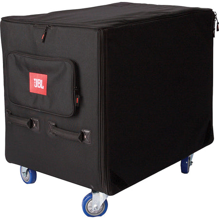 Padded transporter with wheeled base for JBL VRX918S subwoofer; 1200D nylon construction with water-repellent backing; 10mm padded tricot interior; polyethylene front reinforcement ( speaker shield ); zipper closure; exterior accessory pocket; lifting handles; rigid platform with 4 swivel wheels; internal dimensions approx. 74.9 × 59.7 × 50.8 cm; color: black; compatibility: VRX918S / VRX918S-WH.