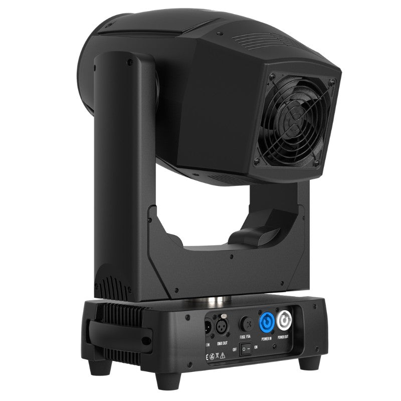 BEAM LED 200 W ( 9,500 K ) moving head with 2.5° beam and electronic focus ; 13 color + white wheel, 14 fixed gobos , frost ; 8 and 16 -facet prisms with bidirectional rotation and overlapping; PAN 540° , TILT 270° movement, 8/16 bits and auto-repositioning; DMX-512 19/24 channels , master-slave and standalone modes; dimmer 0–100 %, strobe 1–25 fps; connectors 3-pin XLR IN/OUT and PowerCON 16 A IN/OUT ; power supply 100–240 V AC , 250 W max. , fuse F5A/250 V ; IP20 ; dimensions 306 × 183 × 433 mm ; weight 11.6 kg ; Includes 2 omegas, PowerCON-Schuko cable and manual.