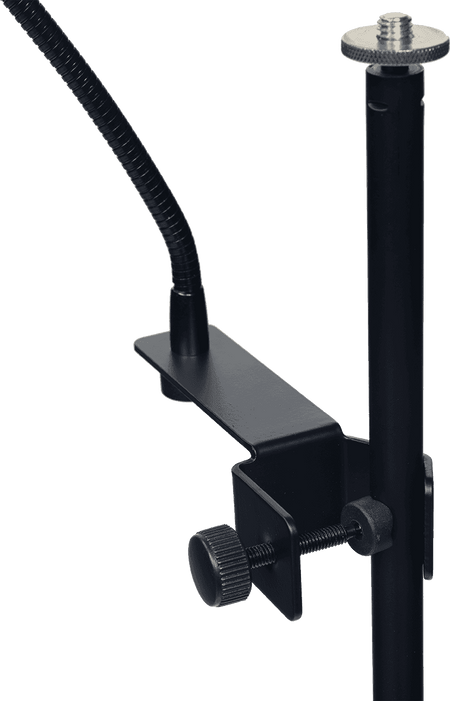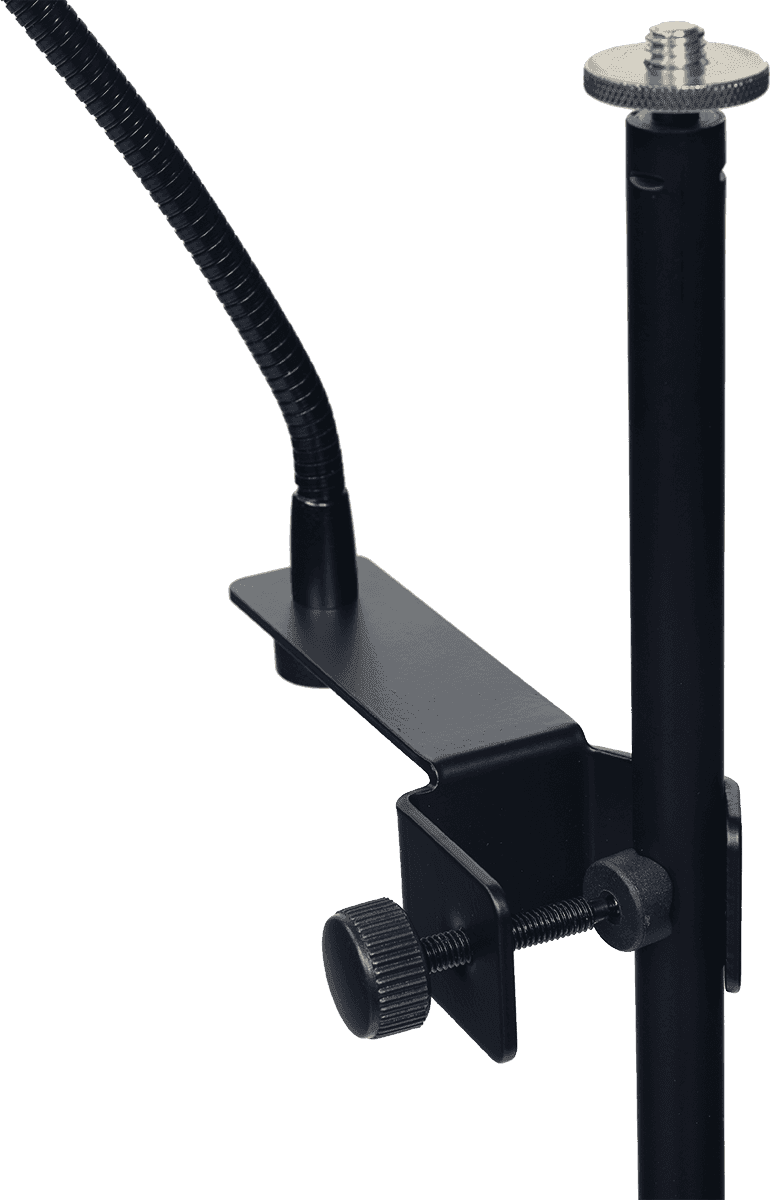 • Abrazadera universal: Mecanismo de tornillo adaptable a la mayoría de soportes tubulares y pies de micro del mercado.