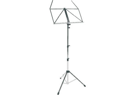 Atril de partituras plegable de estructura tubular metálica reforzada. Configuración de altura ajustable de amplio rango (aprox. 74 a 138 cm). Acabado mixto con base trípode en color negro y superficie de apoyo en acabado cromado resistente. Dimensiones plegado de 54 x 9 x 9 cm y peso aproximado de 1.9 kg. Sistema de tres secciones con bloqueos de seguridad y pies de goma antideslizantes para máxima estabilidad.