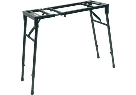 Soporte técnico para instrumentos de tecla con diseño tipo mesa y estructura de acero reforzado. El sistema ofrece regulación independiente de altura y anchura de la plataforma, permitiendo adaptar la superficie de apoyo a las dimensiones específicas del equipo. Incorpora patas plegables para facilitar el transporte y almacenamiento plano. Acabado en pintura negra mate de alta resistencia y puntos de contacto con protección de goma para evitar deslizamientos y daños en el equipo.