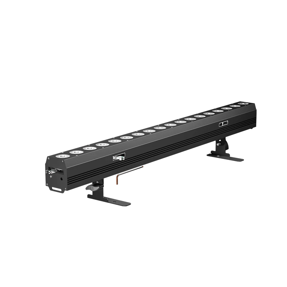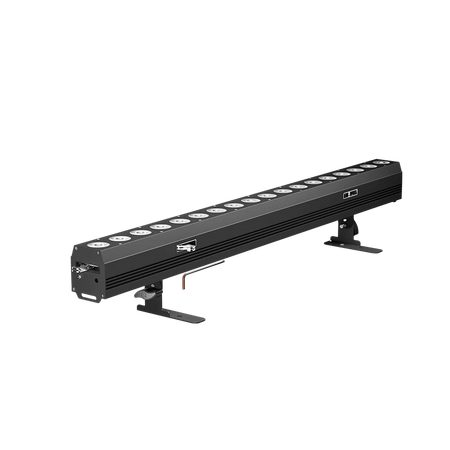 Modular aluminum LED Wall Washer, 18×18 W RGBWA+UV, 16-bit dimmer 0 – 100%, 25° beam, beam lux 3 264 lux@2 m, passive recirculating ventilation, DMX512 (12/108/120 CH), continuous free-splicing, AC 100–240 V.