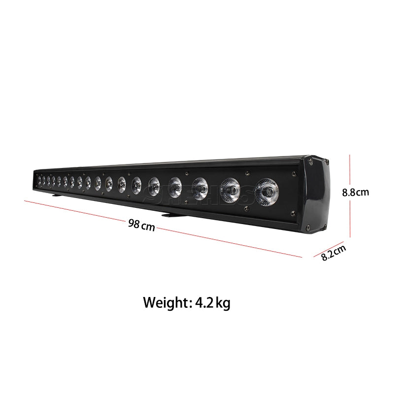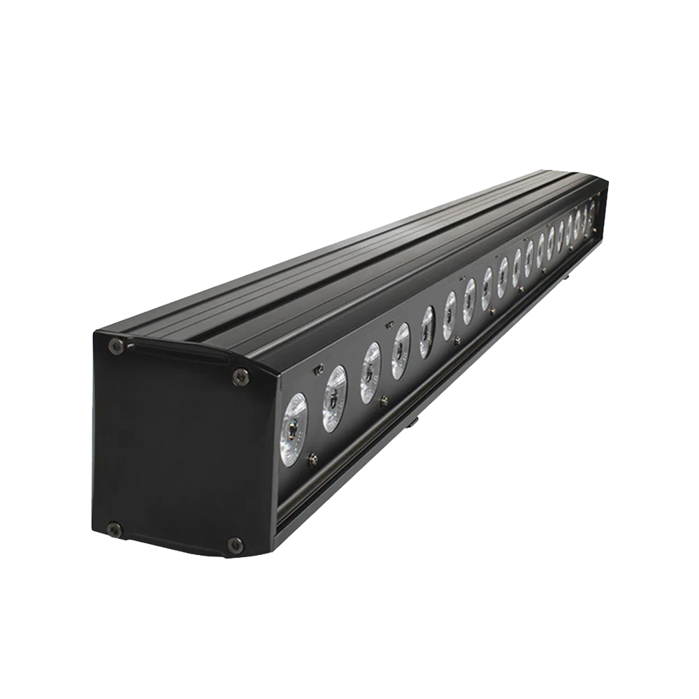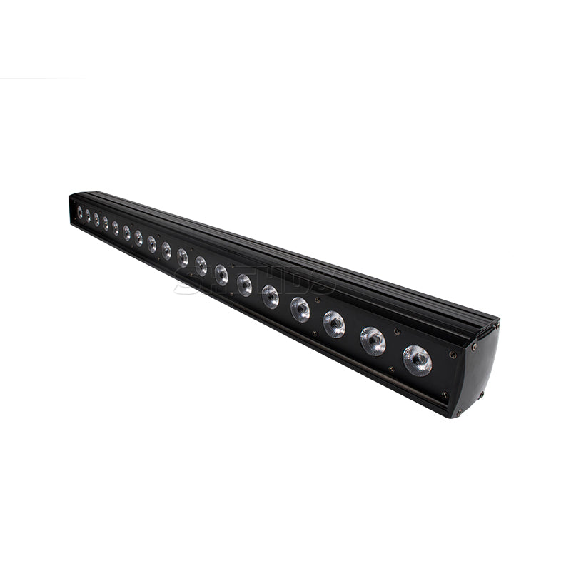 LED Wall Washer in aluminum alloy with 18×18 W RGBWA+UV, DMX512 (11/29/119 channels), consumption 324 W, format 98×8.2×8.8 cm, weight 4.2 kg, ultra-slim profile for uniform surface washing.