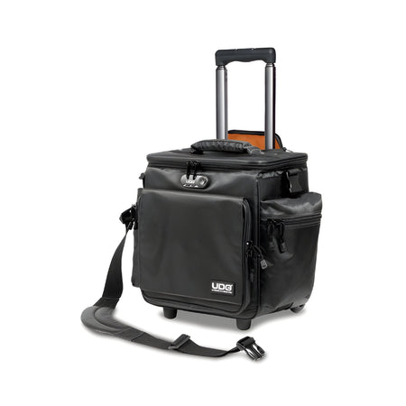 The UDG U9981BL/OR Ultimate SlingBag Trolley DeLuxe is designed for mobile DJs who need to transport up to 60 12" records , a laptop up to 13" , and all their small equipment with maximum comfort and security. Made from water-resistant 420D nylon with high-density foam padded walls, it protects your equipment from bumps, dust, and splashes. It features a three-position telescopic trolley with ultra-smooth inline wheels, heavy-duty spring-loaded handles, and a built-in TSA combination lock for added peace of mind. A large front pocket and two side pockets allow you to carry computers, cameras, headphones, MP3 players, and cables, and it also includes two CD Wallet 24s for control discs or CDs.
