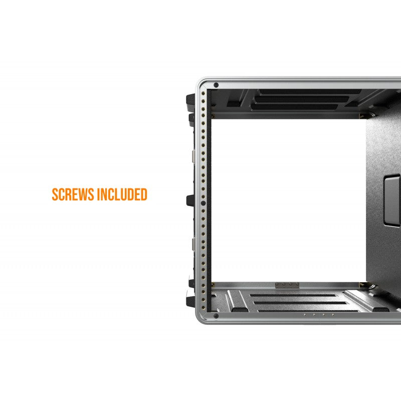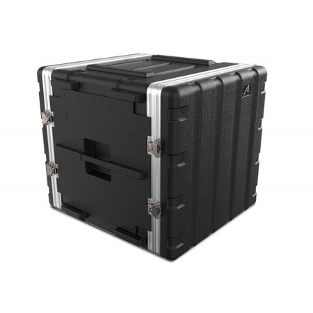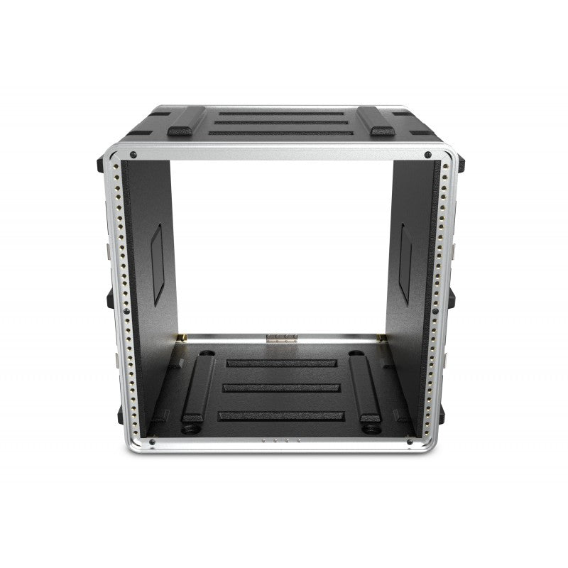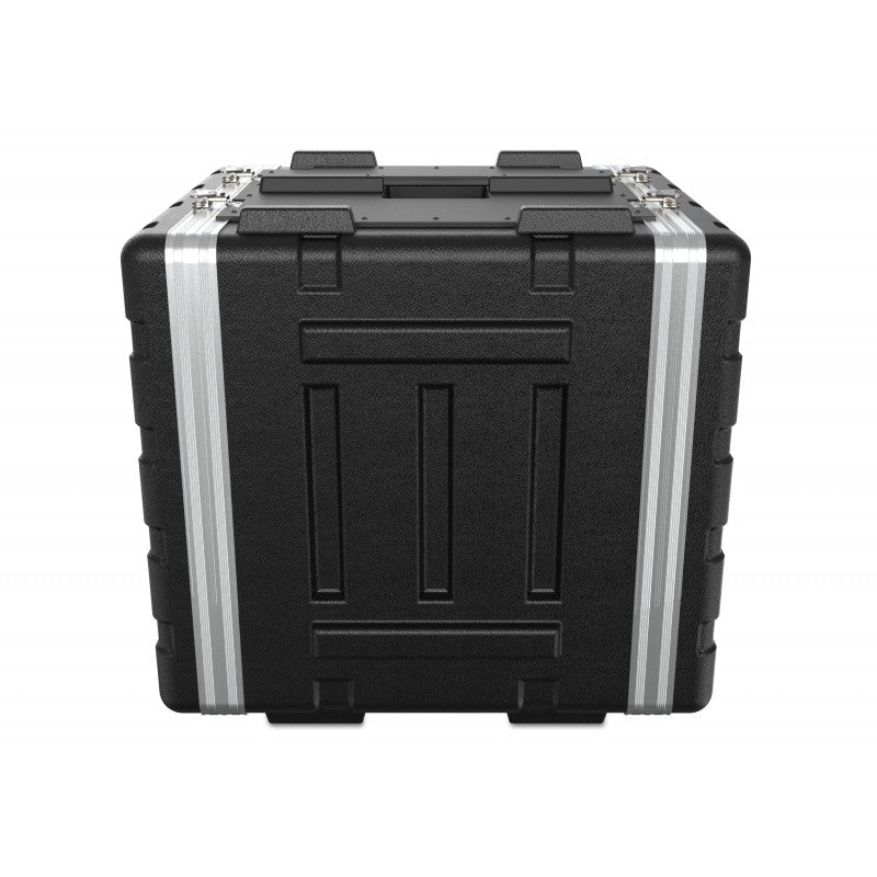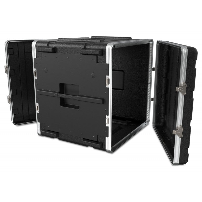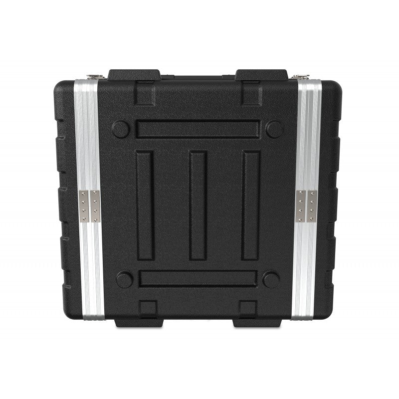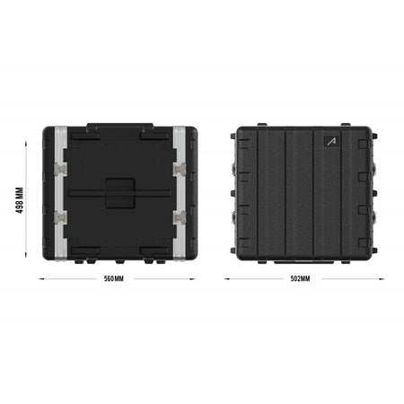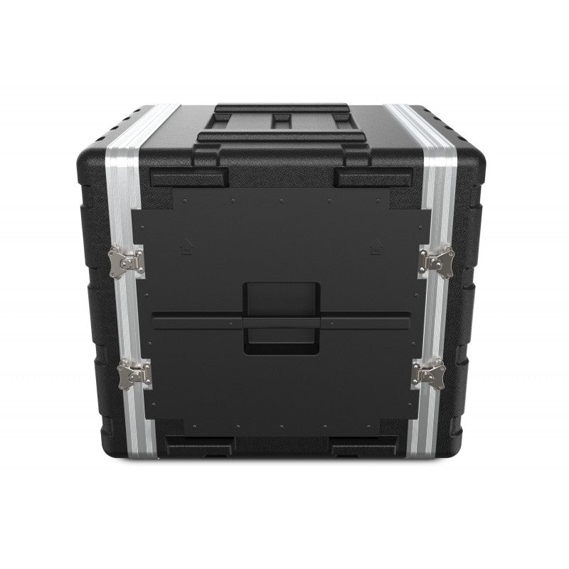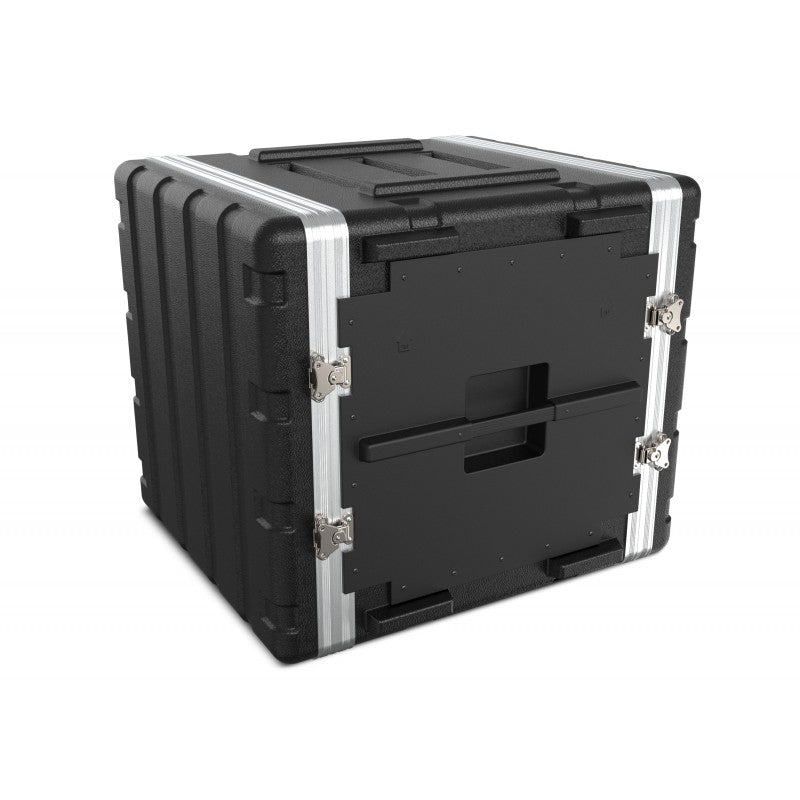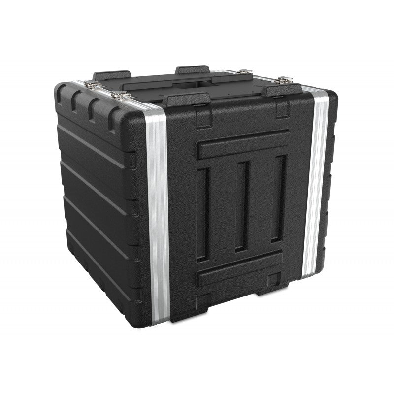 Flightcase formato rack de 19 pulgadas con capacidad de 10 unidades de altura (10U), fabricado en polietileno (PE) de alta densidad moldeado para máxima resistencia estructural y ligereza. Dimensiones exteriores de 560 x 498 x 502 mm e interiores útiles de 540 x 450 x 455 mm. Incluye tapas frontal y trasera removibles con cierres de seguridad tipo mariposa (butterfly locks) y asas de transporte ergonómicas integradas en el chasis. Diseño con esquinas reforzadas y superficie texturizada apilable. Acabado en color negro y peso en vacío de 9,4 Kg.