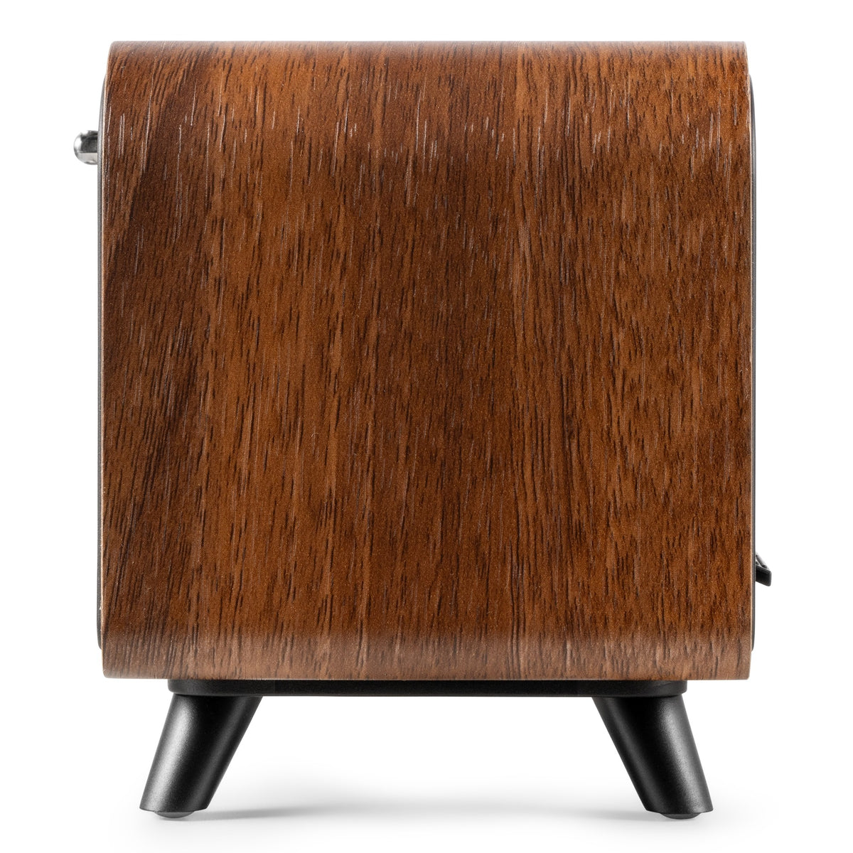 The casing is made of a high-quality material with an aesthetic dark wood finish, giving it its characteristic retro and elegant look.