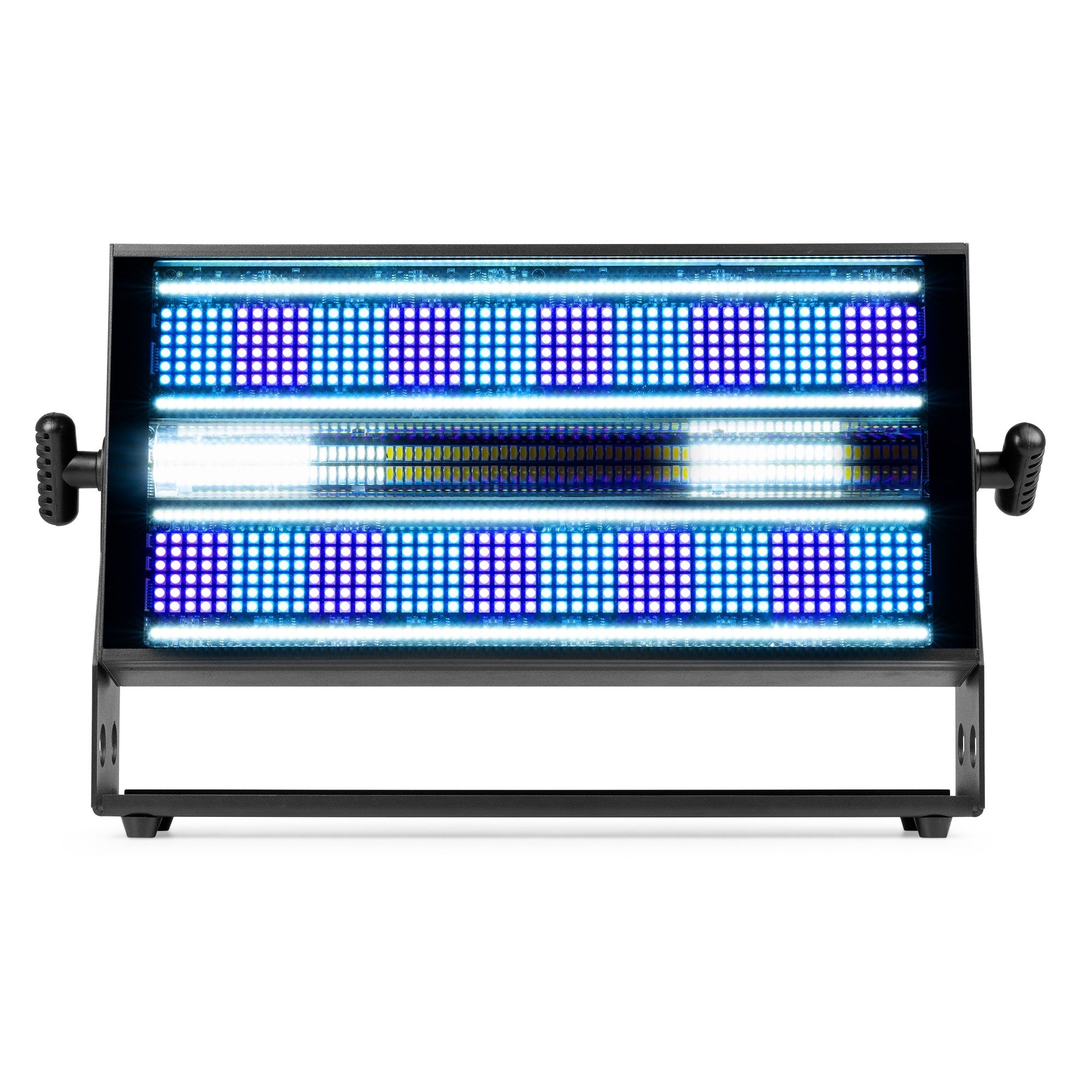 The BS1200 is a powerful, multifunctional fixture designed to function as a strobe, blinder, and color wash light, thanks to its 1,160 SMD LEDs. The LED panel is divided into several sections and, with its RGB mixing system, can flash in any desired color. Additionally, the luminaire features a central strip with 240 cool white SMD LEDs and four rows containing a total of 320 cool white and warm white SMD LEDs. These sections can be controlled independently, allowing you to recreate the classic look of a traditional strobe light. The BS1200 allows the creation of unique and colorful lighting effects and is easy to operate via DMX or in standalone mode with automatic functions. Perfect for shows and events of any scale.