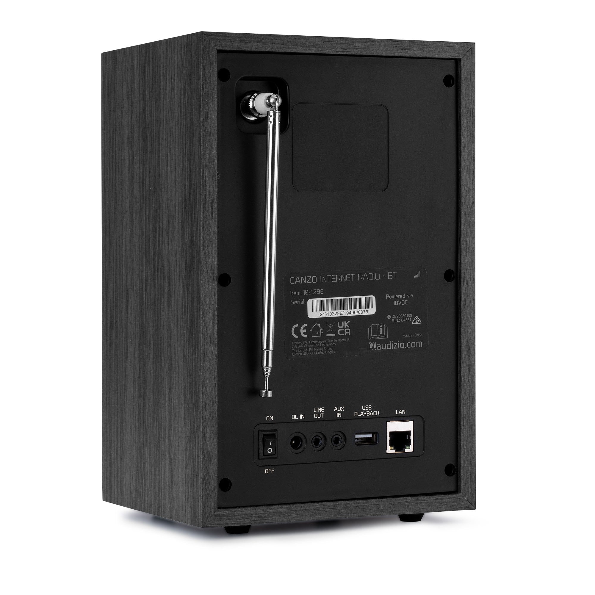 You can connect the Audizio Canzo to the internet in two ways: wirelessly via your Wi-Fi network (compatible with 802.11b/g/n) or via a wired connection using the RJ45 Ethernet LAN port for maximum stability.