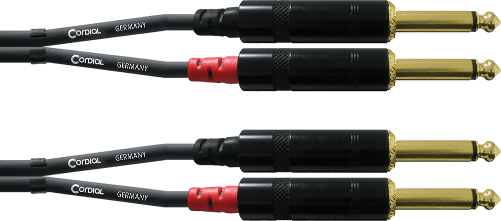 Este es un cable "dual mono". Utiliza dos conectores mono separados para el canal izquierdo y derecho, a diferencia de un cable estéreo TRS que lleva ambas señales en un solo conector. Es el formato estándar para equipos profesionales con salidas L/R separadas.