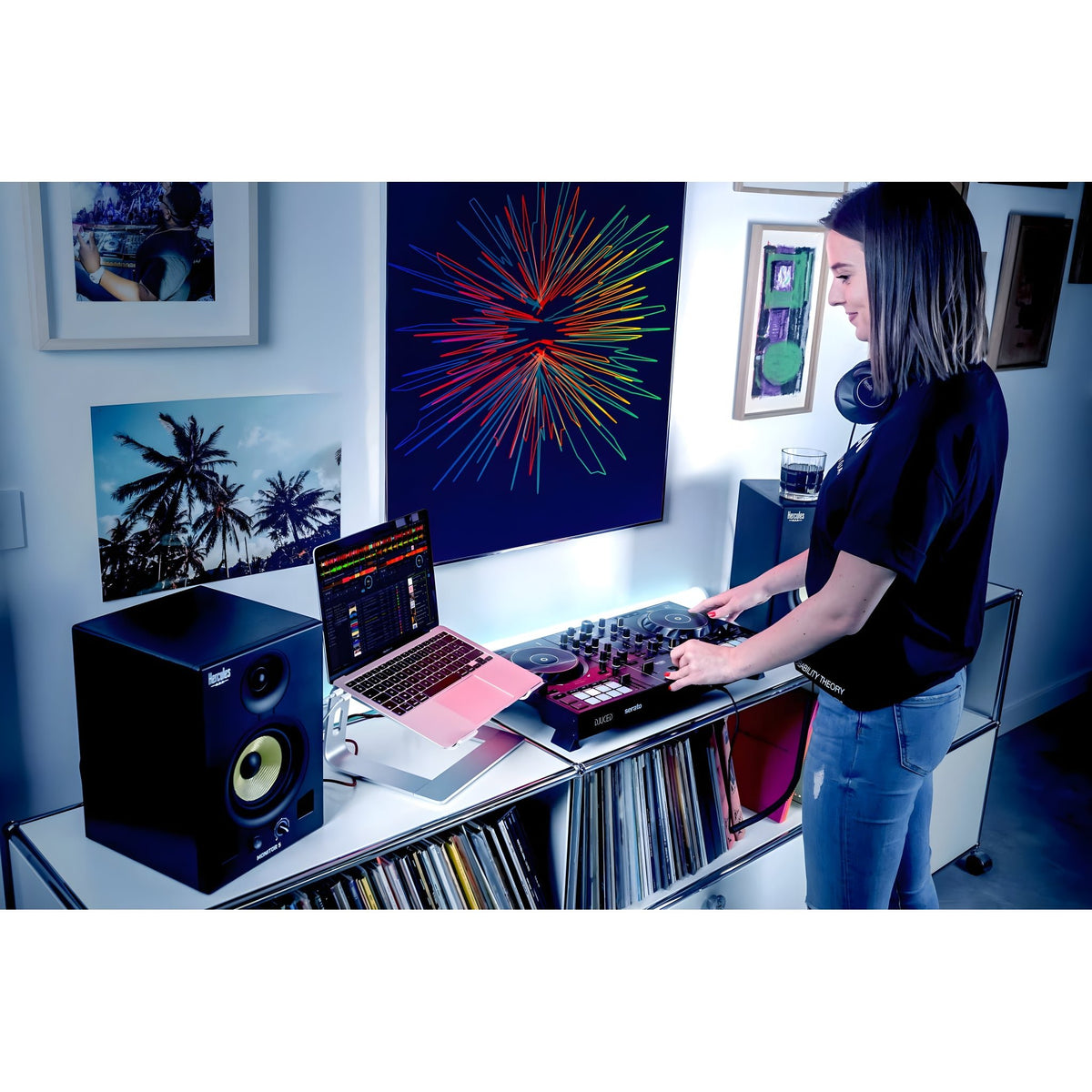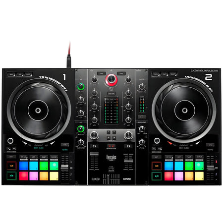 The Hercules DJControl Inpulse 500 elevates your DJ experience with a solid metal construction, 14cm tactile jog wheels, 16 RGB pads in eight modes, and a Filter/FX rack with four dedicated effects. Perfect for learning, practicing, and performing.