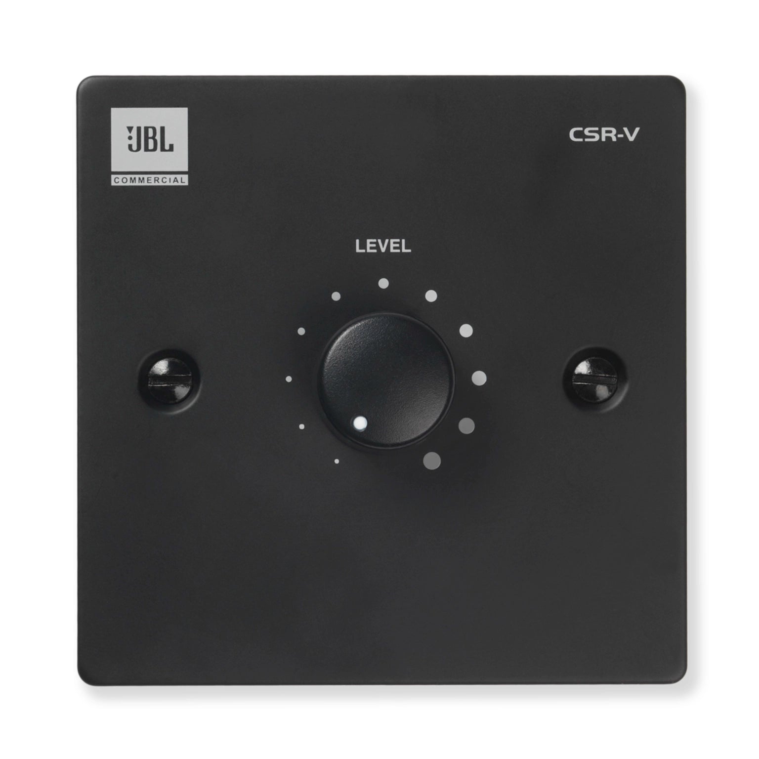 JBL CSR-V-EU-BLK wall-mounted remote control: DC voltage volume control for JBL Commercial equipment; RJ-45 connection ( Cat 5 cable, T568B ), range 305 m ; European format 86 × 86 mm ( 60 mm centres), profile approx. 18.8 mm ; compatibility with CSM mixers, VMA/CSMA mixer-amplifiers and CSA amplifiers (see model details); volume attenuation function; black finish.