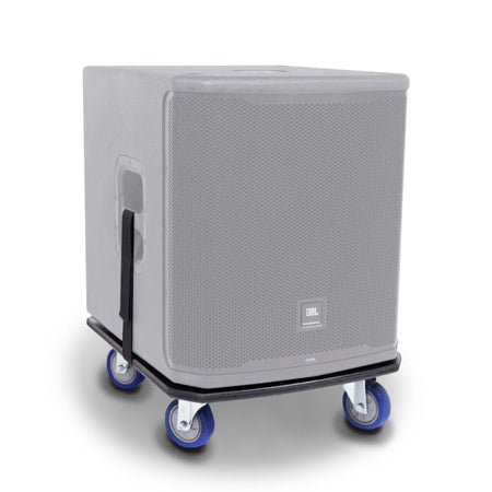 JBL PRX915XLF subwoofer transport trolley base; 19 mm profiled plywood top, 4 x 102 mm swivel casters , 50 mm hook-and-loop fastening straps ; product dimensions 584 × 483 × 146 mm (L × W × H), weight 6.2 kg ; black finish.