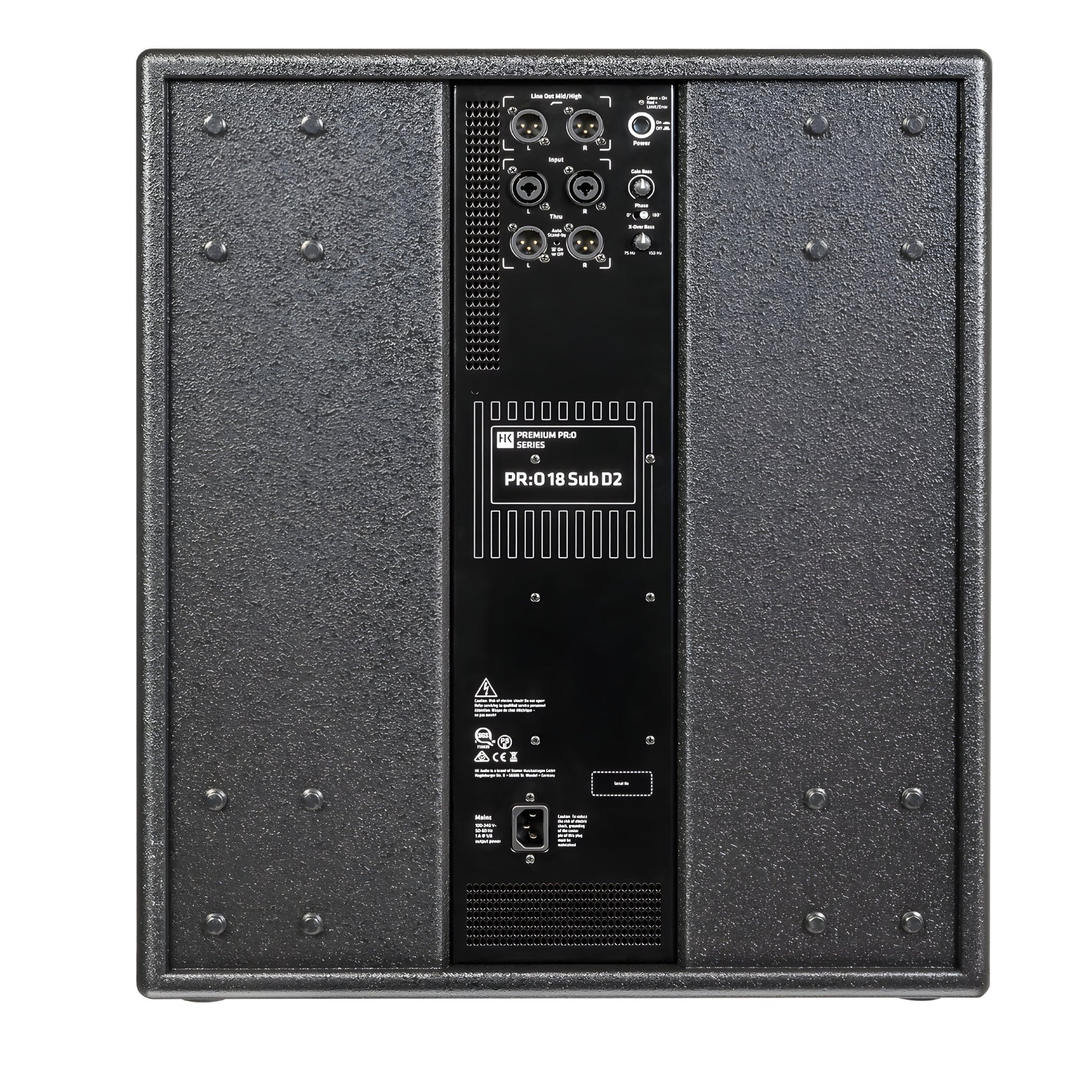 The HK Audio PR:O 118 SUB D2 is a powered bass-reflex subwoofer designed to authoritatively extend the bass response of Premium PR:O systems and other full-range loudspeakers. Its 18" transducer and 1,200 W (peak) Class D amplification deliver a solid, accurate foundation, while the built-in active crossover allows 2.1 systems to be configured directly via the Mid/High L/R outputs without the need for crossovers in the tops. With a max SPL of 127 dB (peak) , –6 dB response from 45 Hz , and dedicated controls (gain, crossover frequency 75–150 Hz , phase 0°/180° ), the PR:O 118 SUB D2 offers rapid integration and consistent results for touring, rental, and installation applications.