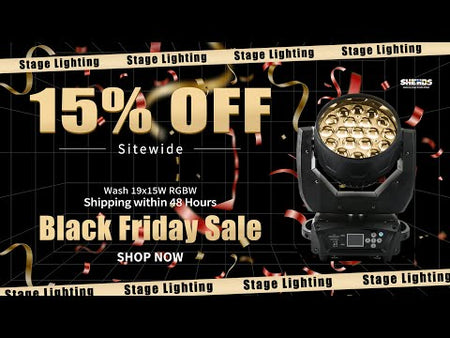 The SHEHDS BWBE1915D moving head features nineteen 15W LEDs in a 4-in-1 RGBW configuration to deliver smooth washes and intense colors, along with a zoom function that varies the beam angle from 8° to 55°. Its 350W auto-ranging electronics ensure stable power (AC 100–240V, 50/60Hz), while the 0–100% mechanical dimmer and 0–10Hz strobe allow for precise effects. Controllable by DMX512 in 16 or 24 channel modes (master/slave, auto, sound) and with 540° pan and 180° tilt, it is perfect for churches, theaters, weddings and nightclubs.