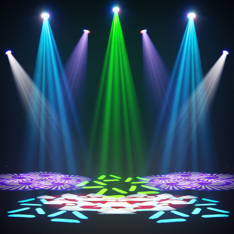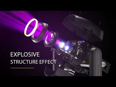 Its optical system includes a 100mm lens, a 0–100% linear dimmer, and a rotating 5-facet prism, generating spectacular multi-beam effects. The color wheel offers nine filters plus aperture, while the fixed and rotating gobo wheels incorporate five designs. Instant Frost softens the beam instantly.