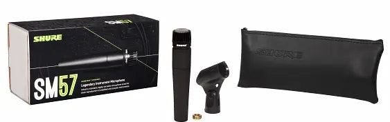 Micrófono dinámico cardioide para instrumento Shure SM57 LC, tipo bobina móvil, respuesta en frecuencia 40 Hz – 15 kHz, patrón polar cardioide unidireccional, sensibilidad –56,0 dBV/Pa (1,6 mV a 1 kHz), impedancia de salida 150 Ω nominal (310 Ω real), conector XLR de 3 pines macho. Construcción en metal fundido con sistema neumático de amortiguación interna. Dimensiones aproximadas 157 × 32 mm (largo × diámetro), peso 284 g. Incluye pinza de micrófono, adaptador de rosca de 3/8" y bolsa de transporte con cremallera.