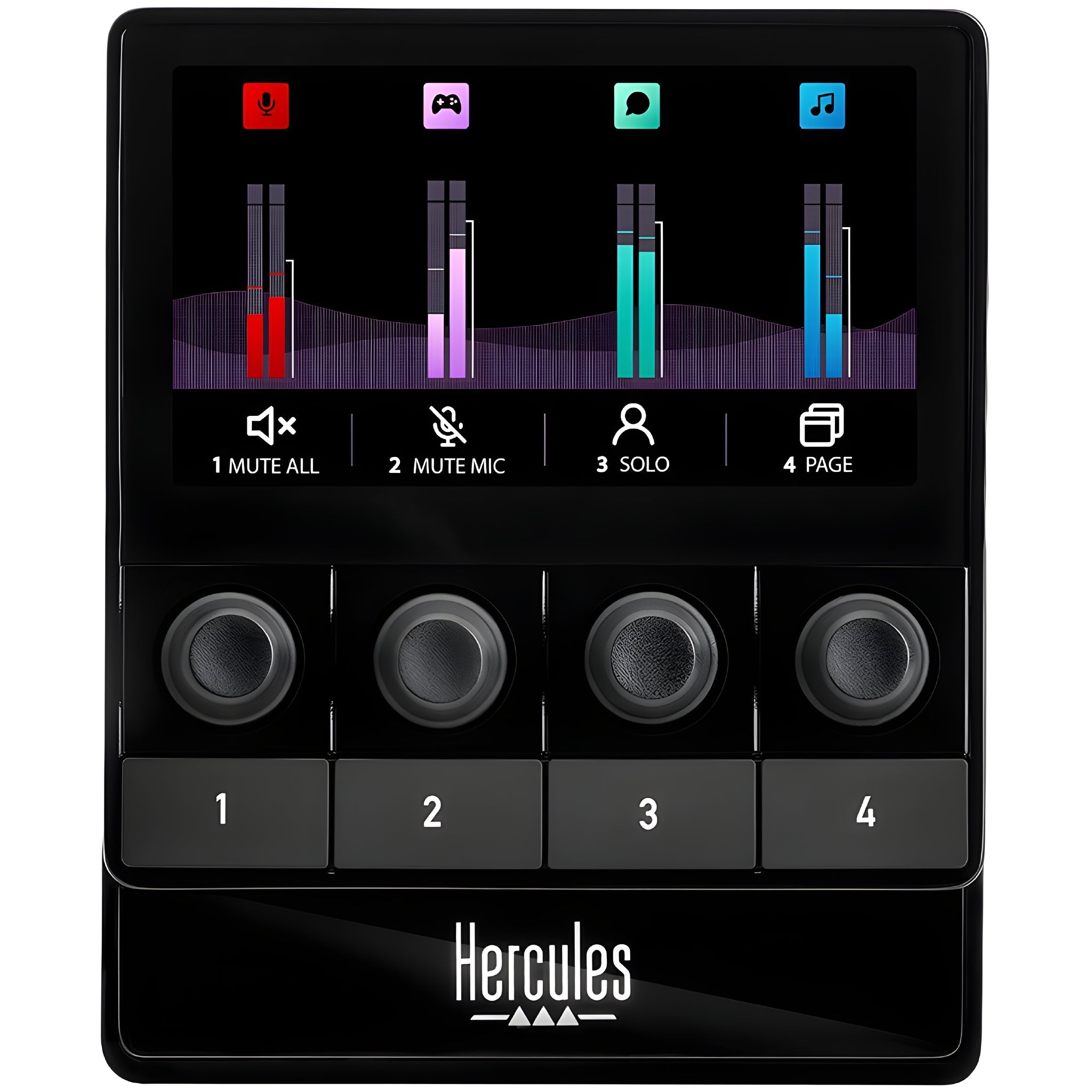 The Hercules DJ Stream 100 is a plug-and-play audio mixer that offers full control of up to 8 simultaneous tracks (2 pages of 4 channels) from its intuitive 4.3″ LCD screen . Designed for streamers and content creators, it allows real-time management of games, chat, music, and USB microphones without the need for additional interfaces.
